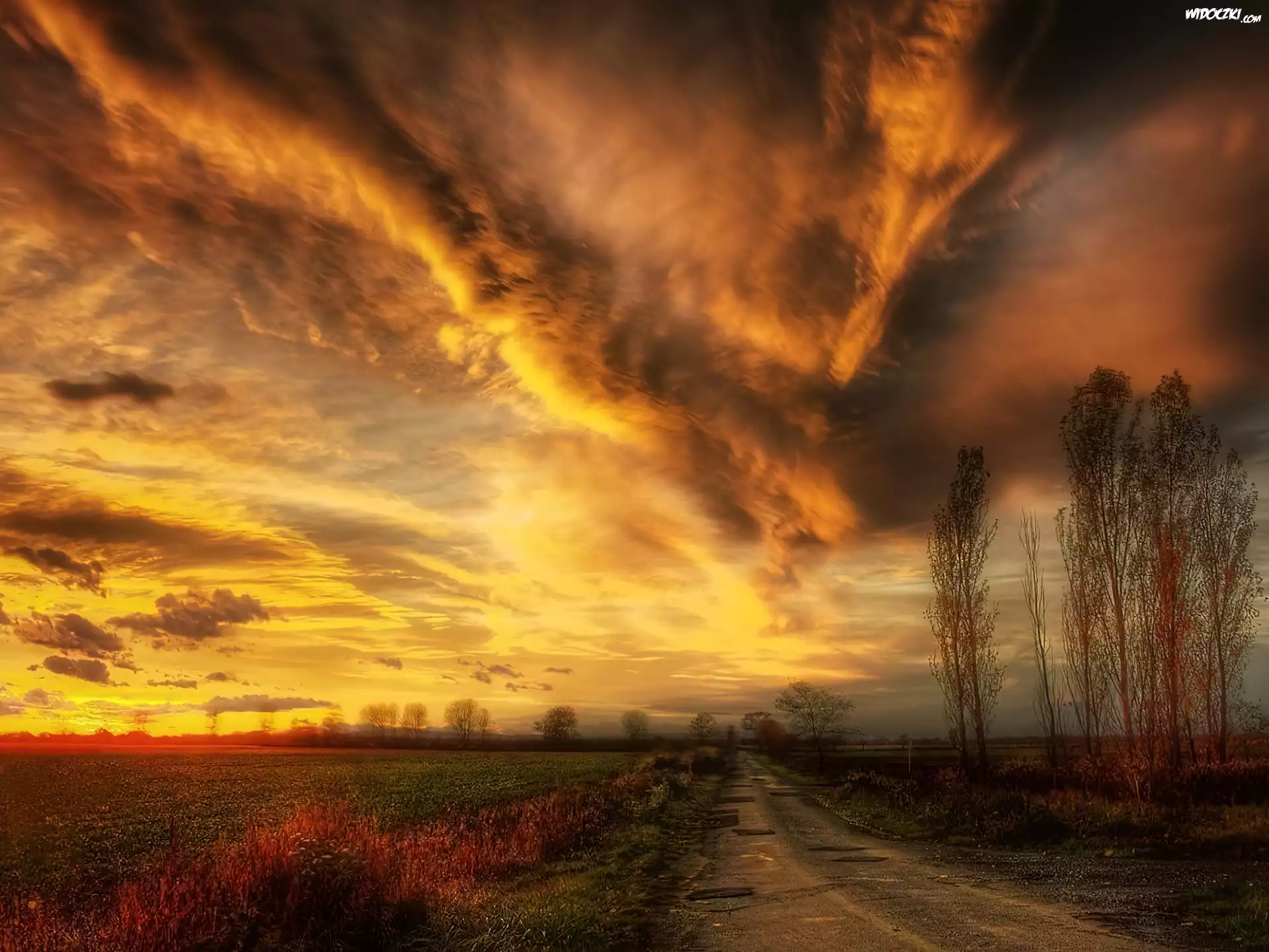Zdjęcia, Chmury, Droga, Zachód, Słońca, Drzewa