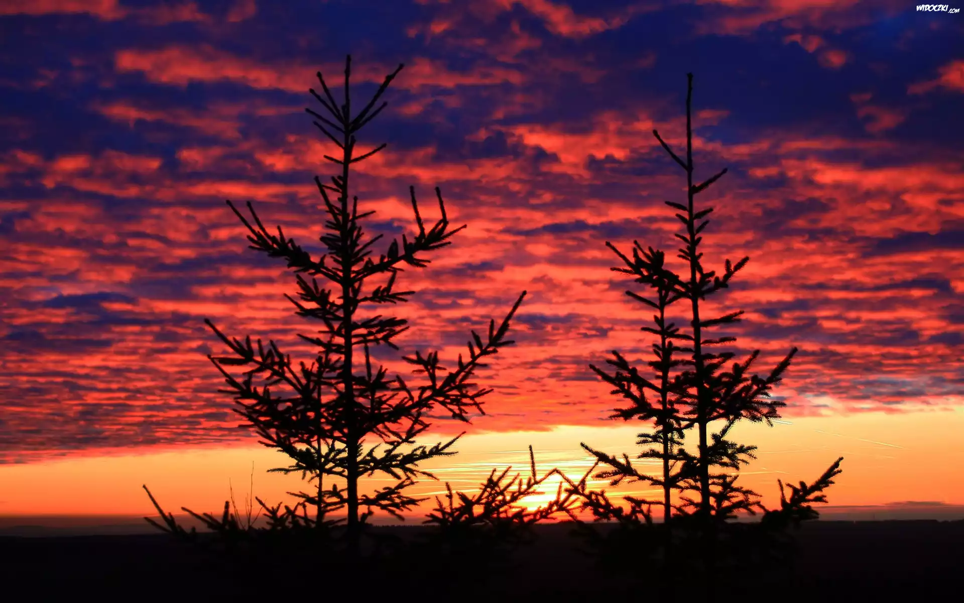Chmury, Zachód Słońca, Drzewa