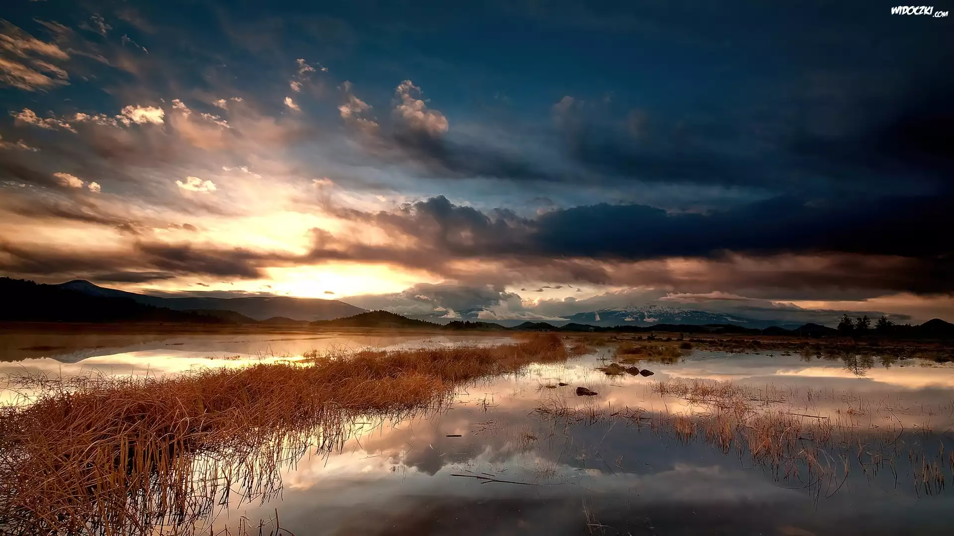 Zdjęcia, Chmury, Góry, Zachód, Słońca, Woda