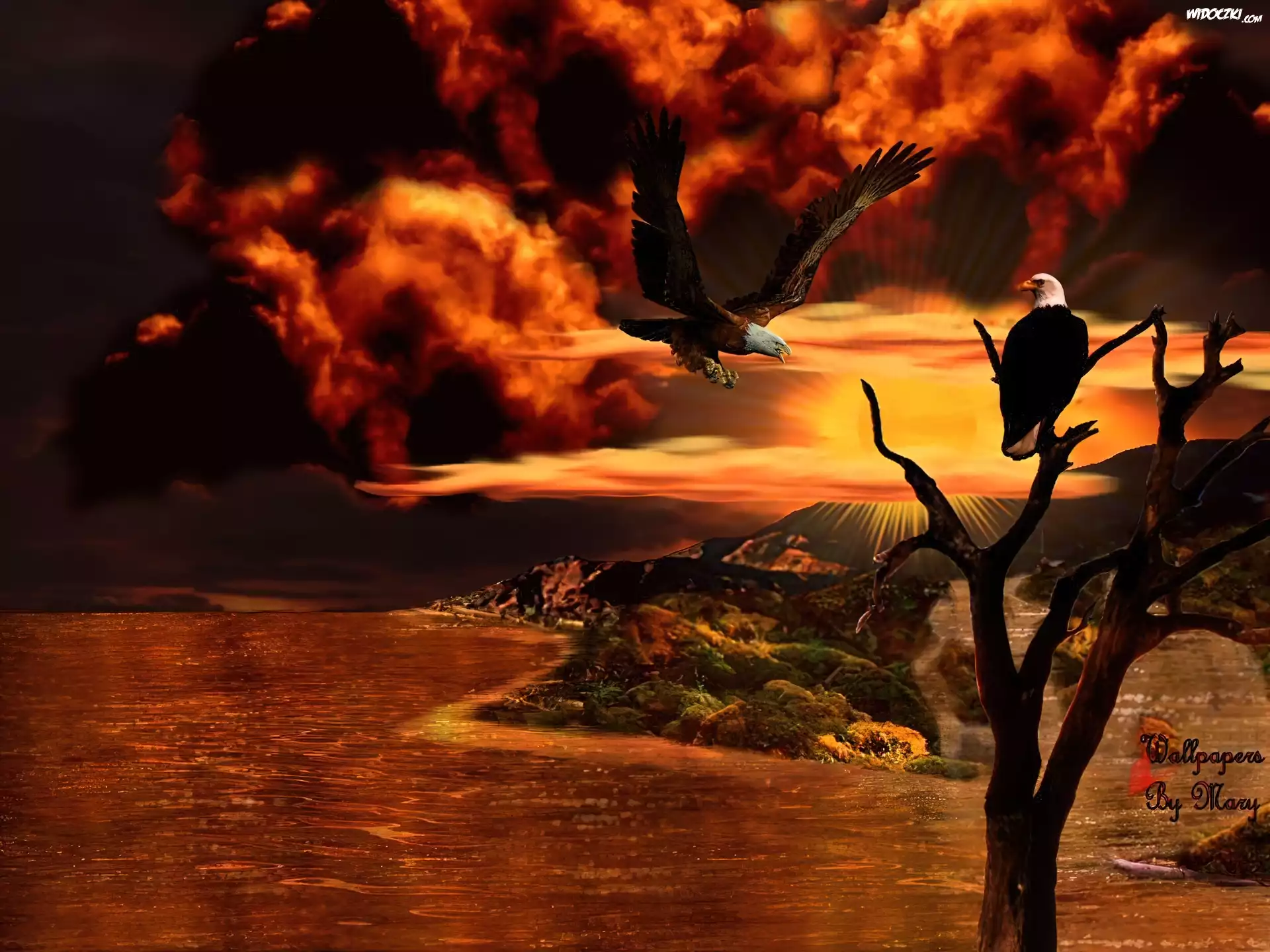 Chmury, Zachód słońca, Orły, Bieliki amerykańskie