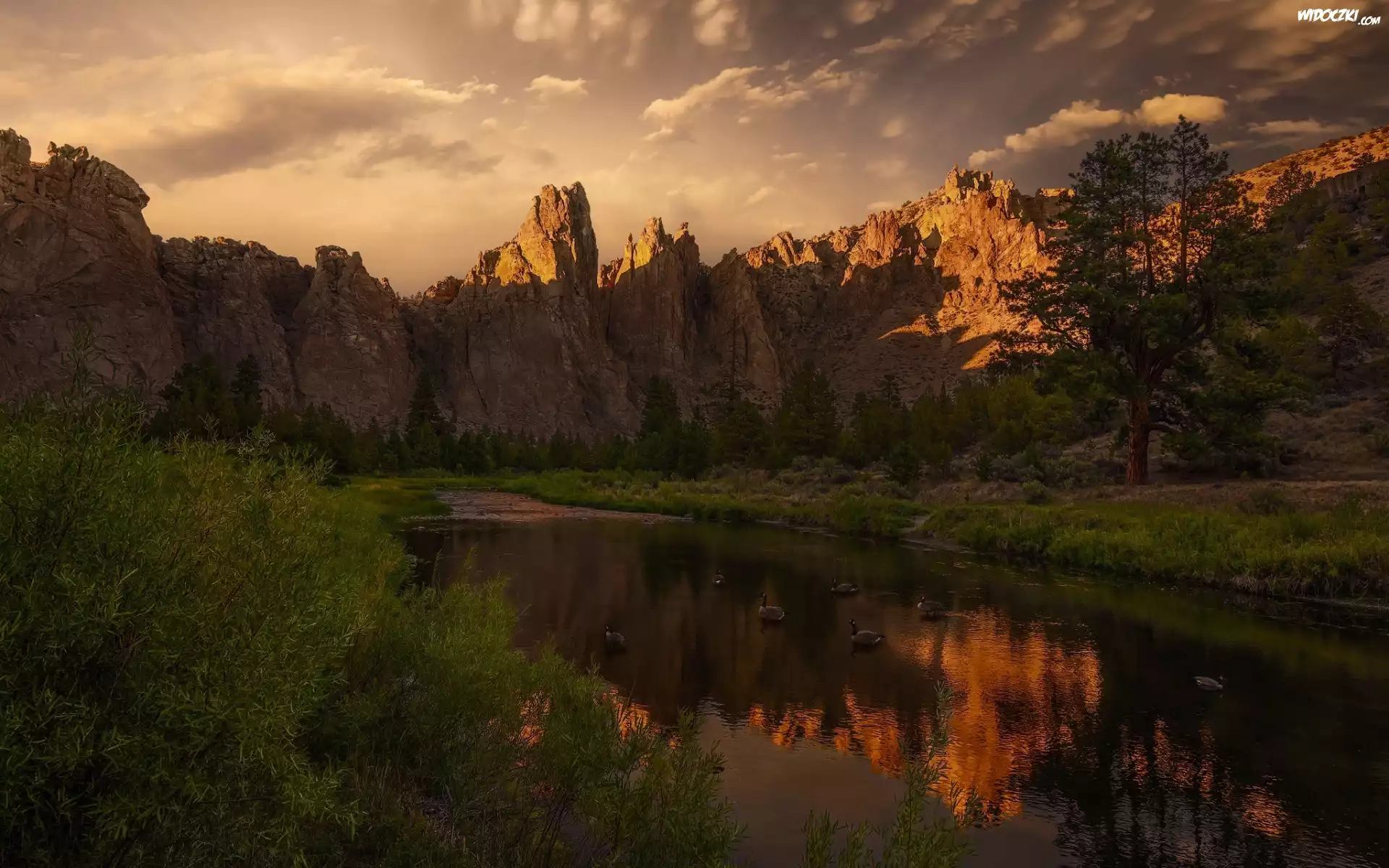 Zdjęcia, Góry, Skały, Staw, Ptaki, Kaczki, Drzewa, Trawa, Chmury