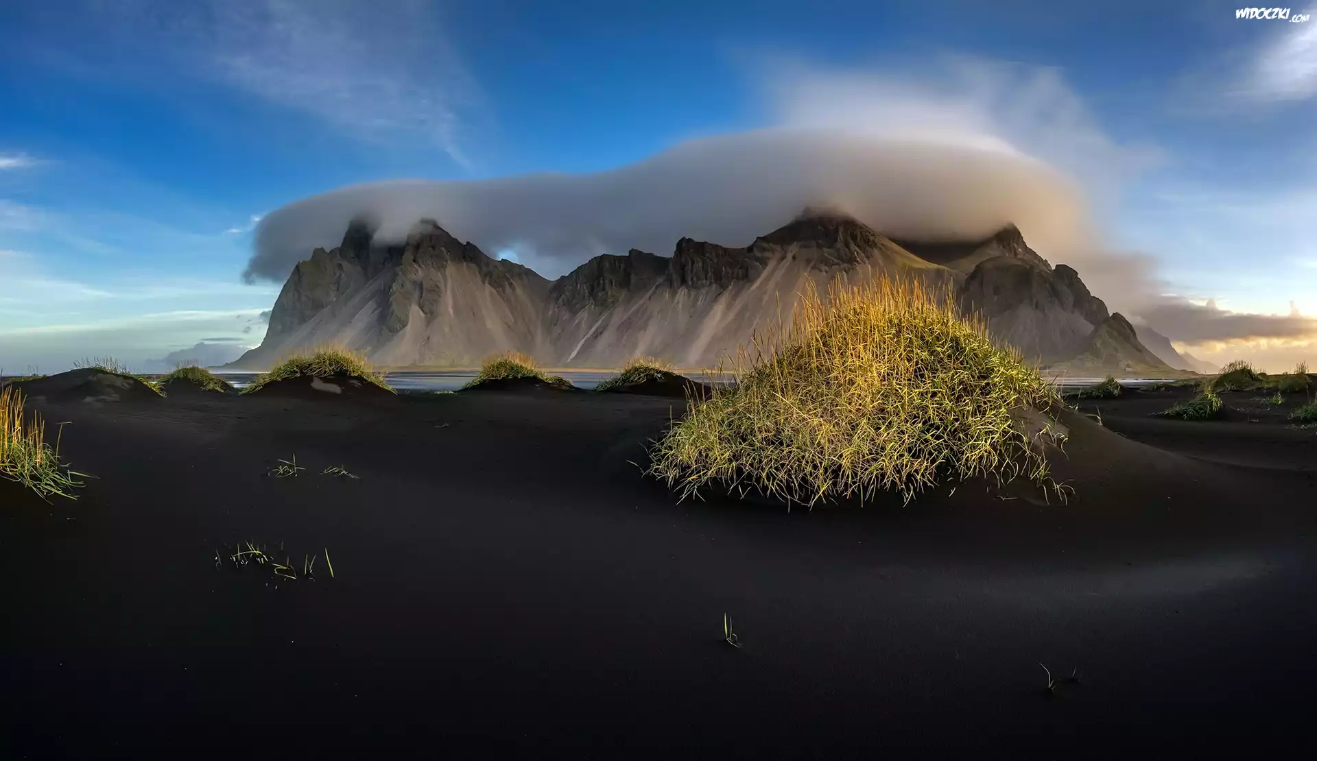 Zdjęcia, Islandia, Góra Vestrahorn, Plaża Stokksnes, Ciemny, Piasek, Roślinność, Morze, Chmury
