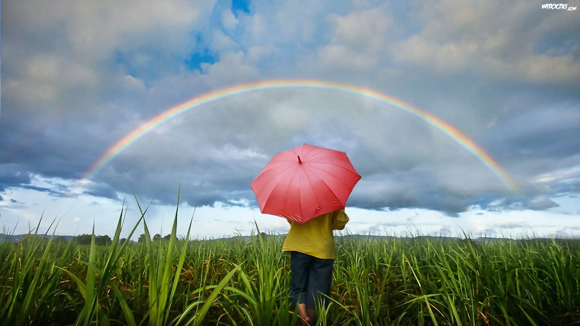 Zdjęcia, Łąka, Tęcza, Chmury, Kobieta