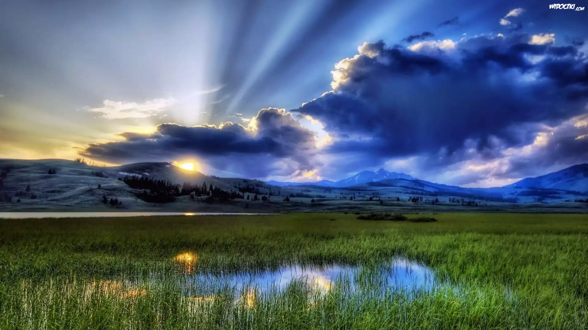 Chmury, Promienie, Słońca, Trawa, Bajorko