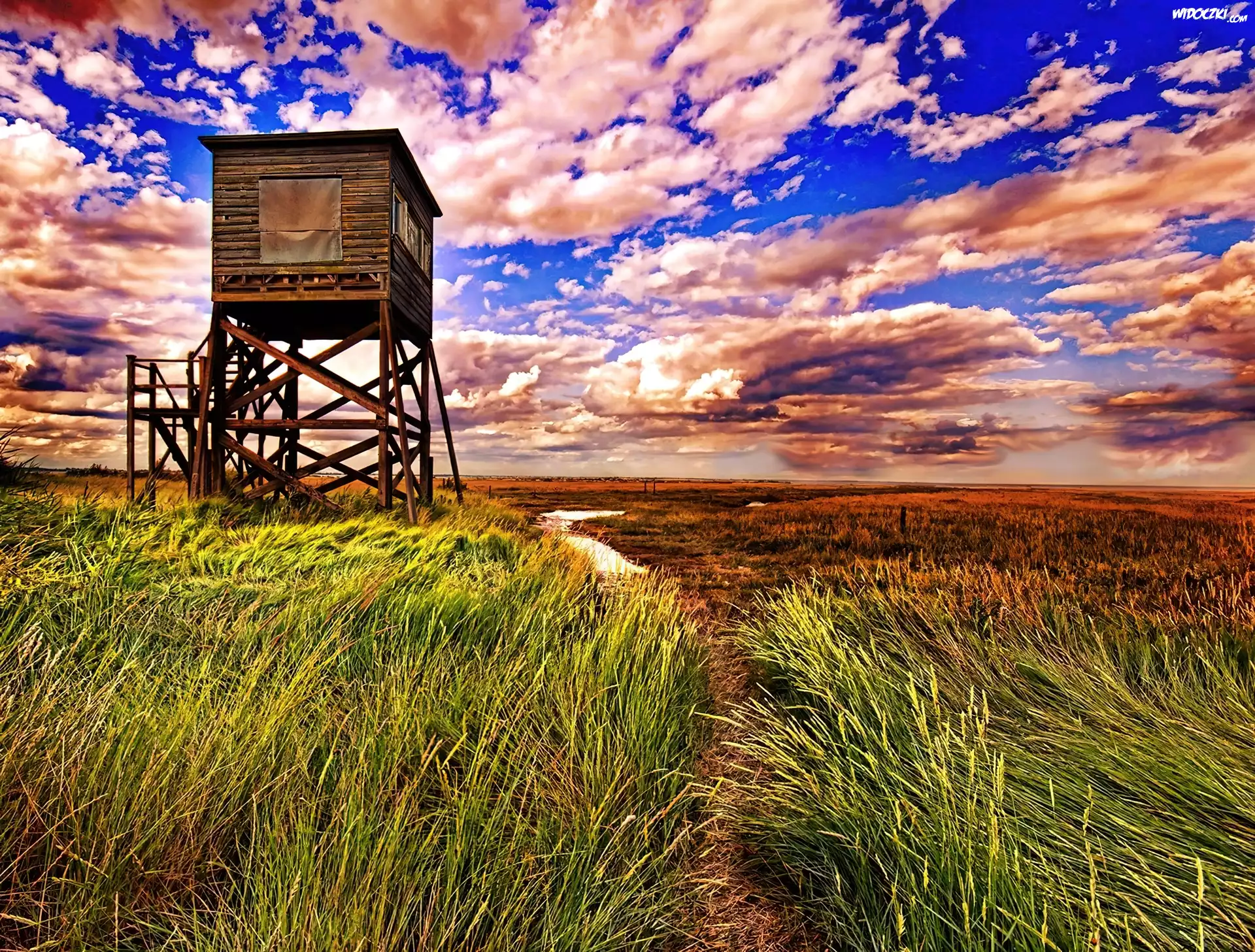 Zdjęcia, Chmury, Zachód, Słońca, Trawa, Domek