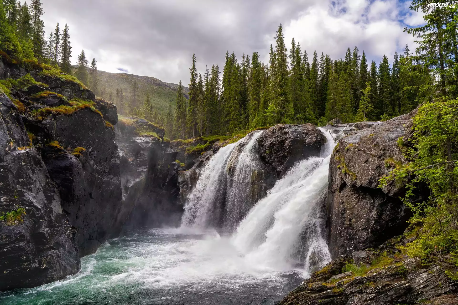 Norwegia, Hemsedal, Wodospad, Rjukandefossen, Skały, Las, Drzewa, Chmury