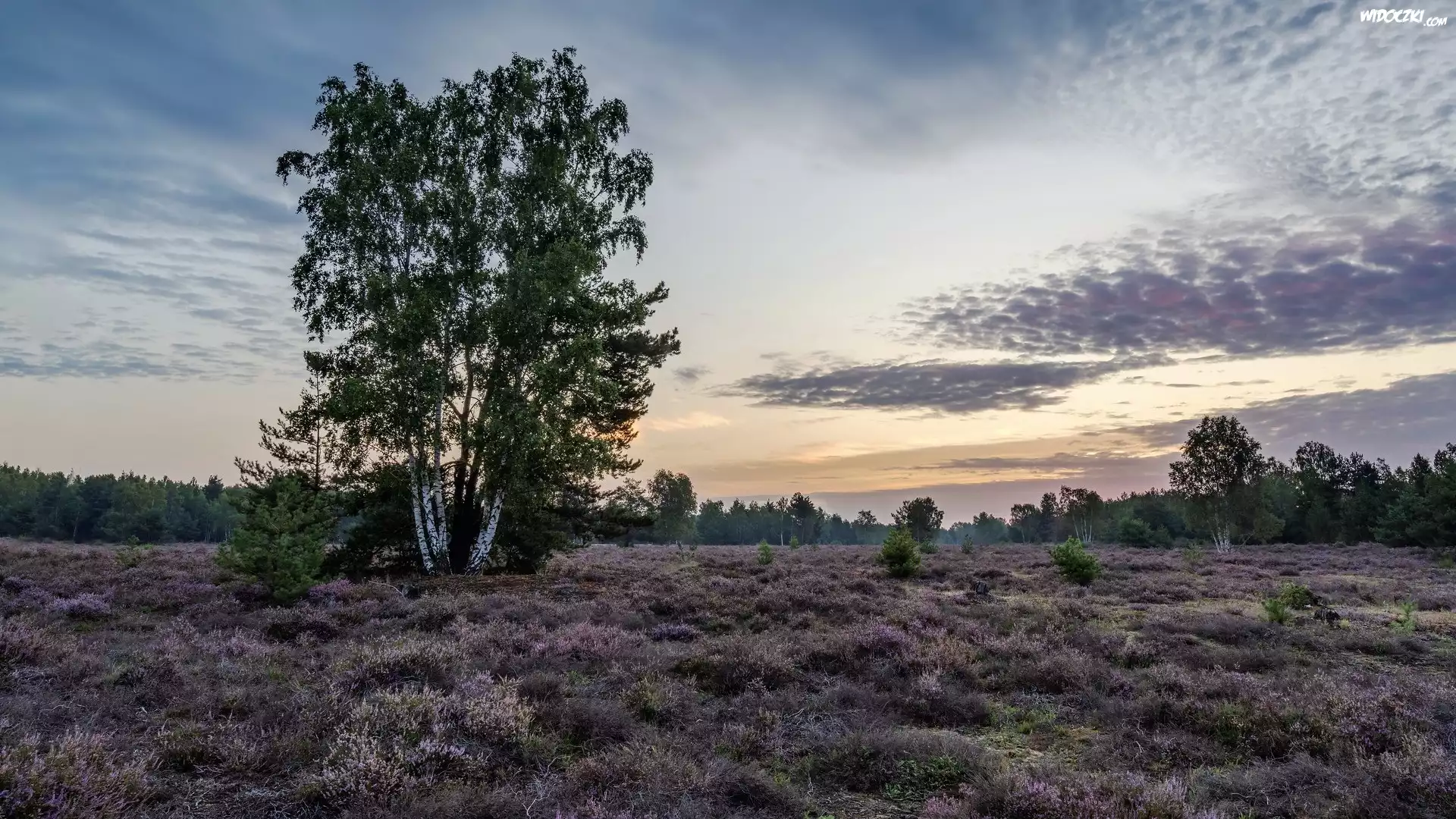 Wrzosowisko, Drzewa, Brzozy, Chmury
