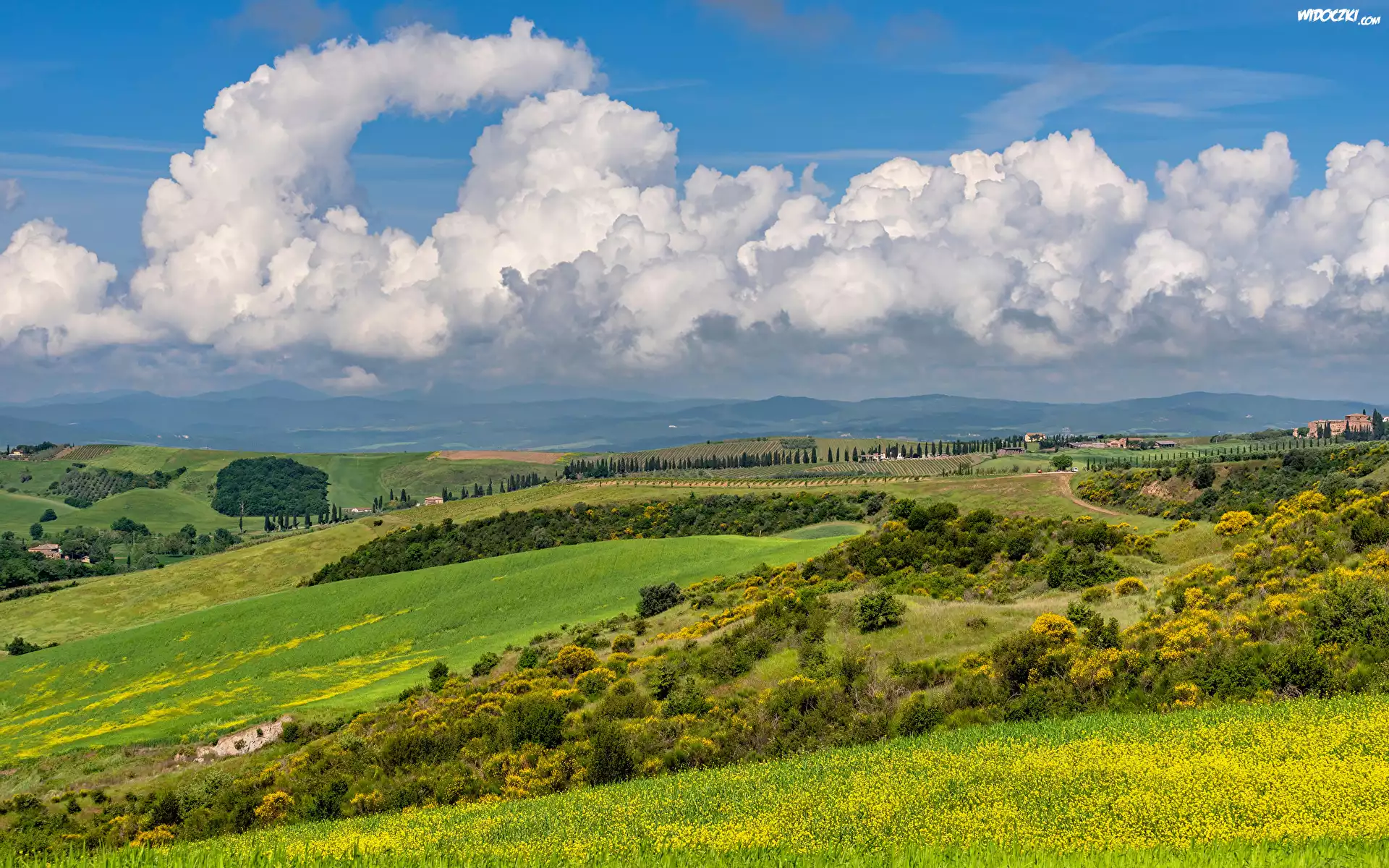 Włochy, Toskania, Wzgórza, Domy, Drzewa, Pola, Łąki, Chmury