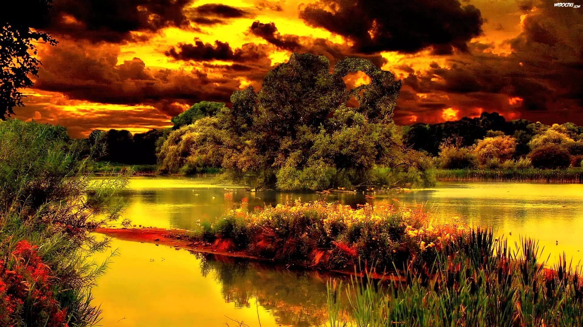 Zdjęcia, Chmury, Woda, Drzewa, Zachód, Słońca