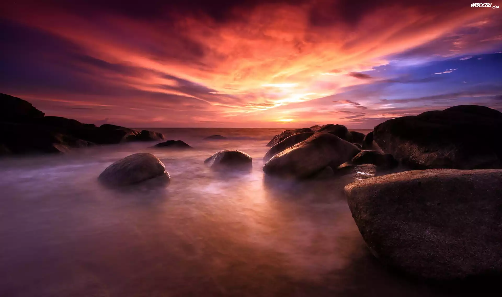 Zdjęcia, Chmury, Morze, Skały, Zachód Słońca