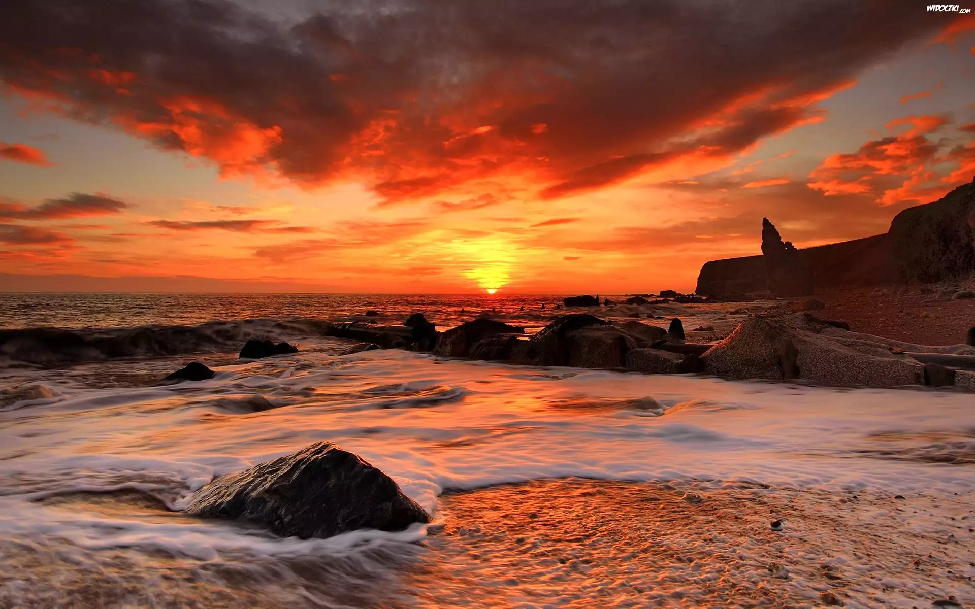 Zdjęcia, Chmury, Morze, Skały, Zachód, Słońca