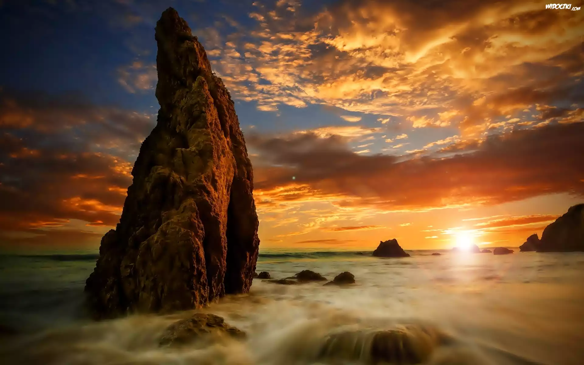 Zdjęcia, Chmury, Morze, Skały, Zachód Słońca