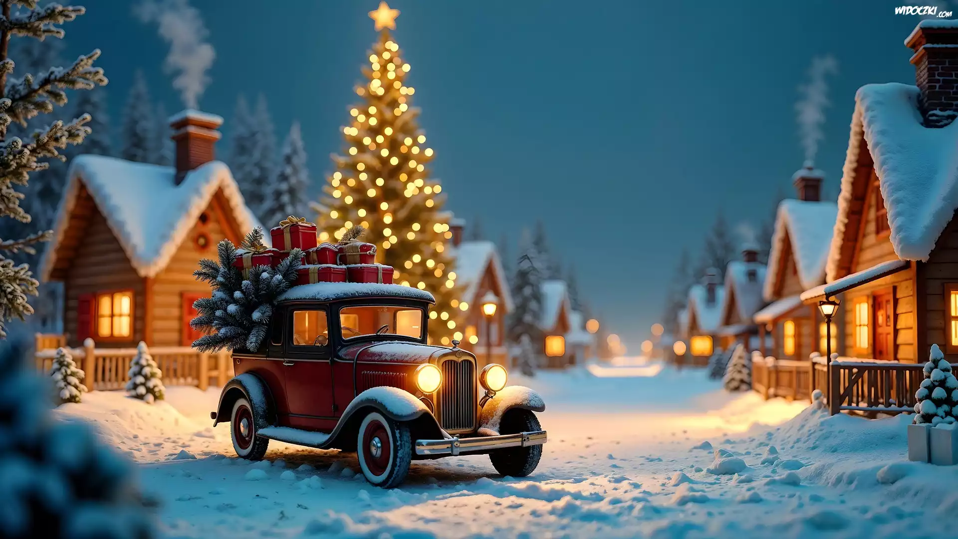 Boże Narodzenie, Domy, Choinka, Samochód, Zima, AI