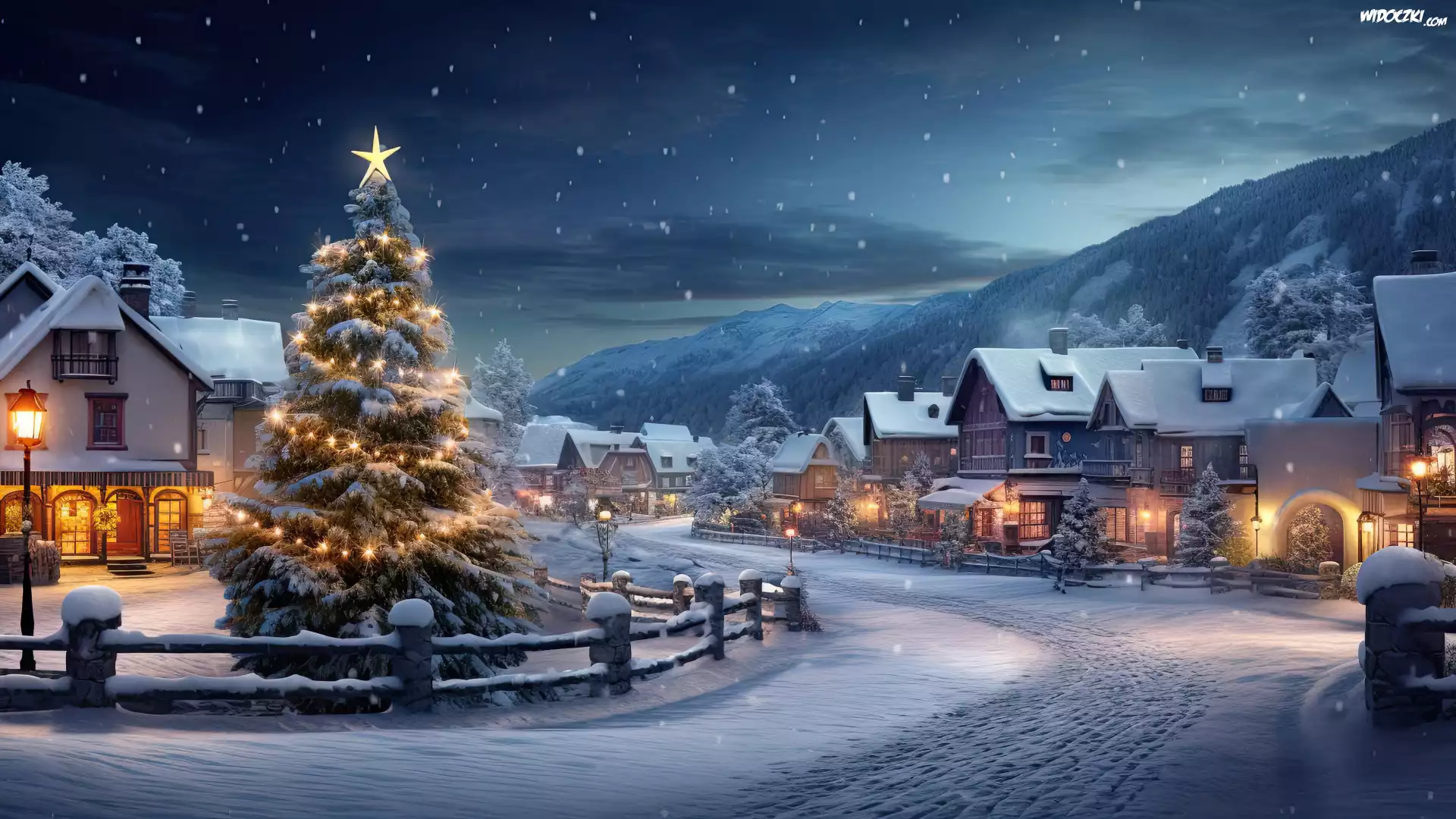 Zdjęcia, Zima, Boże Narodzenie, Choinka, Domy, Ogrodzenie