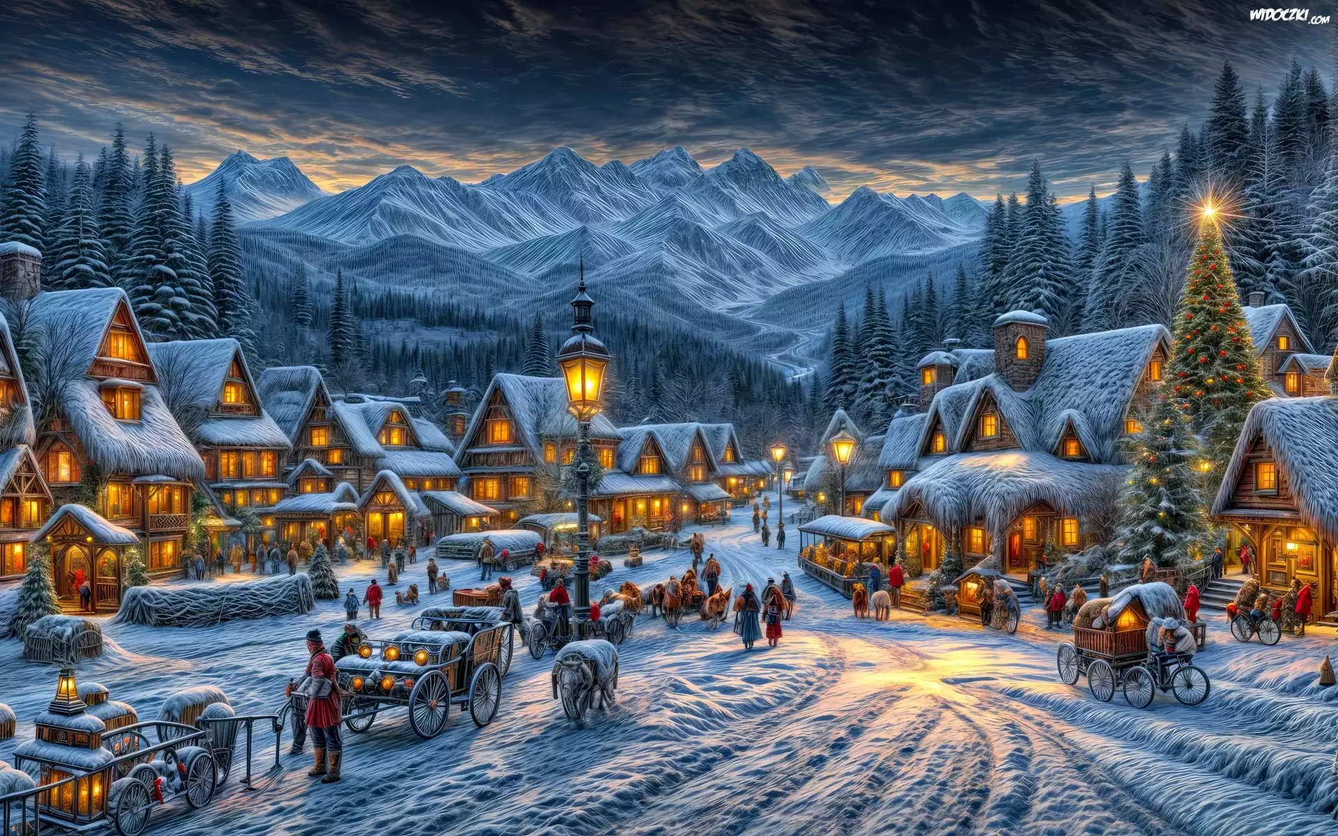 Boże Narodzenie, Zima, Wieś, Powozy, Ludzie, Domy, Droga, Udekorowana, Choinka, Góry, Grafika