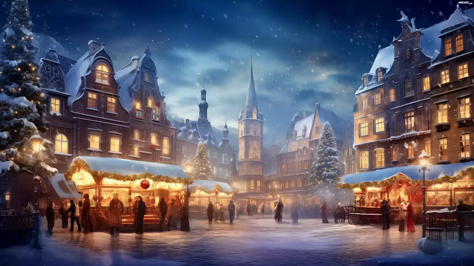Zima, Śnieg, Ludzie, Dekoracje, Stragany, Świąteczne, Choinki, Domy, Wieczór, Światła, 2D