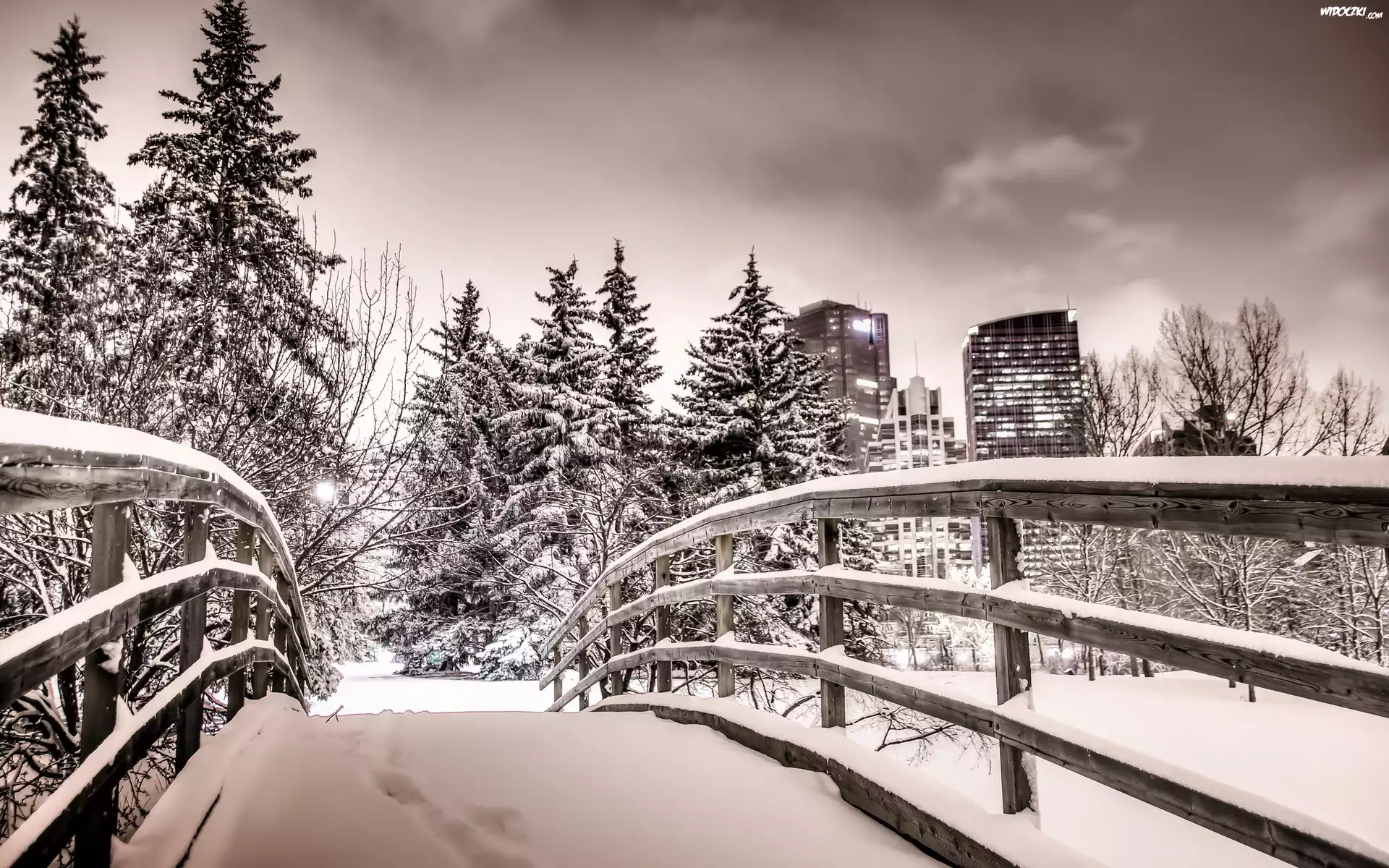 Zdjęcia, Choinki, Śnieg, Most, Park, Miasto