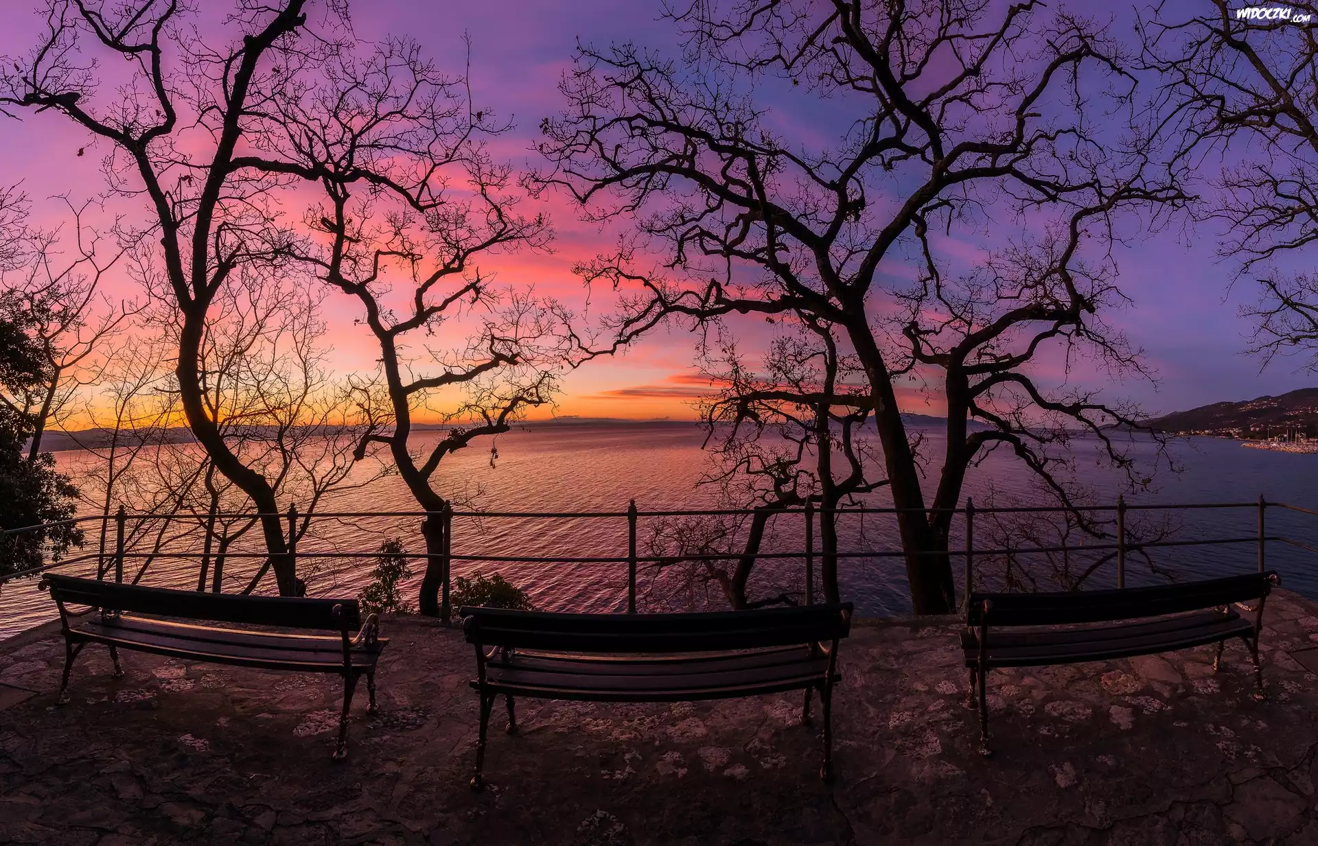 Zdjęcia, Jezioro, Zatoka Kvarner, Drzewa, Ławki, Zachód słońca, Opatija, Chorwacja