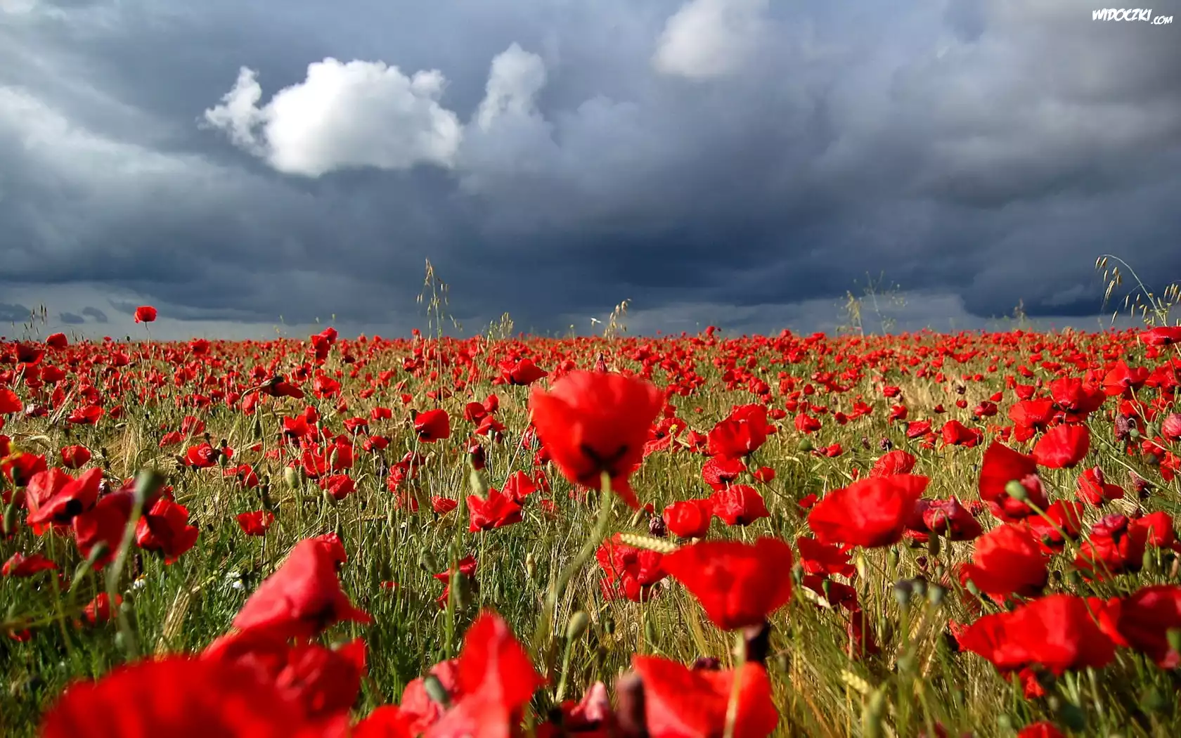 Łąka, Czerwone, Maki, Ciemne, Chmury