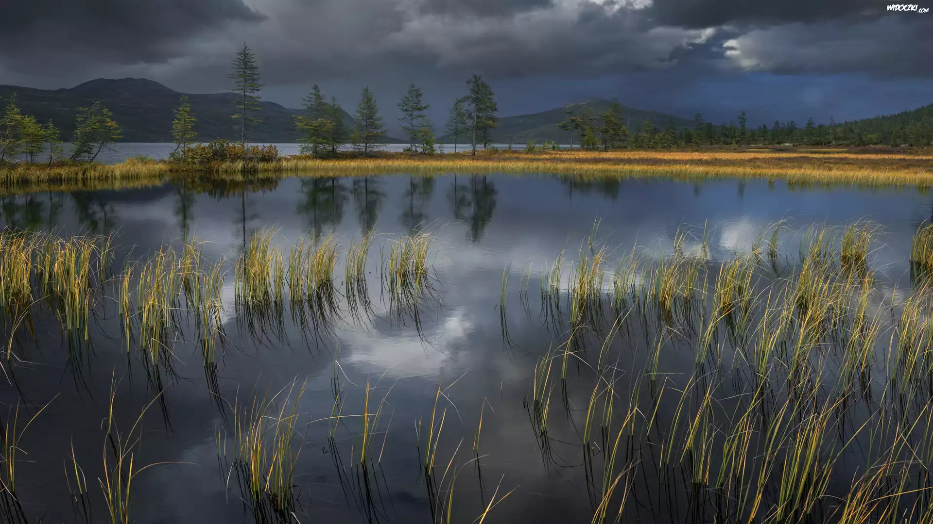Ciemne, Chmury, Szuwary, Drzewa, Jezioro, Jack London, Kołyma, Rosja