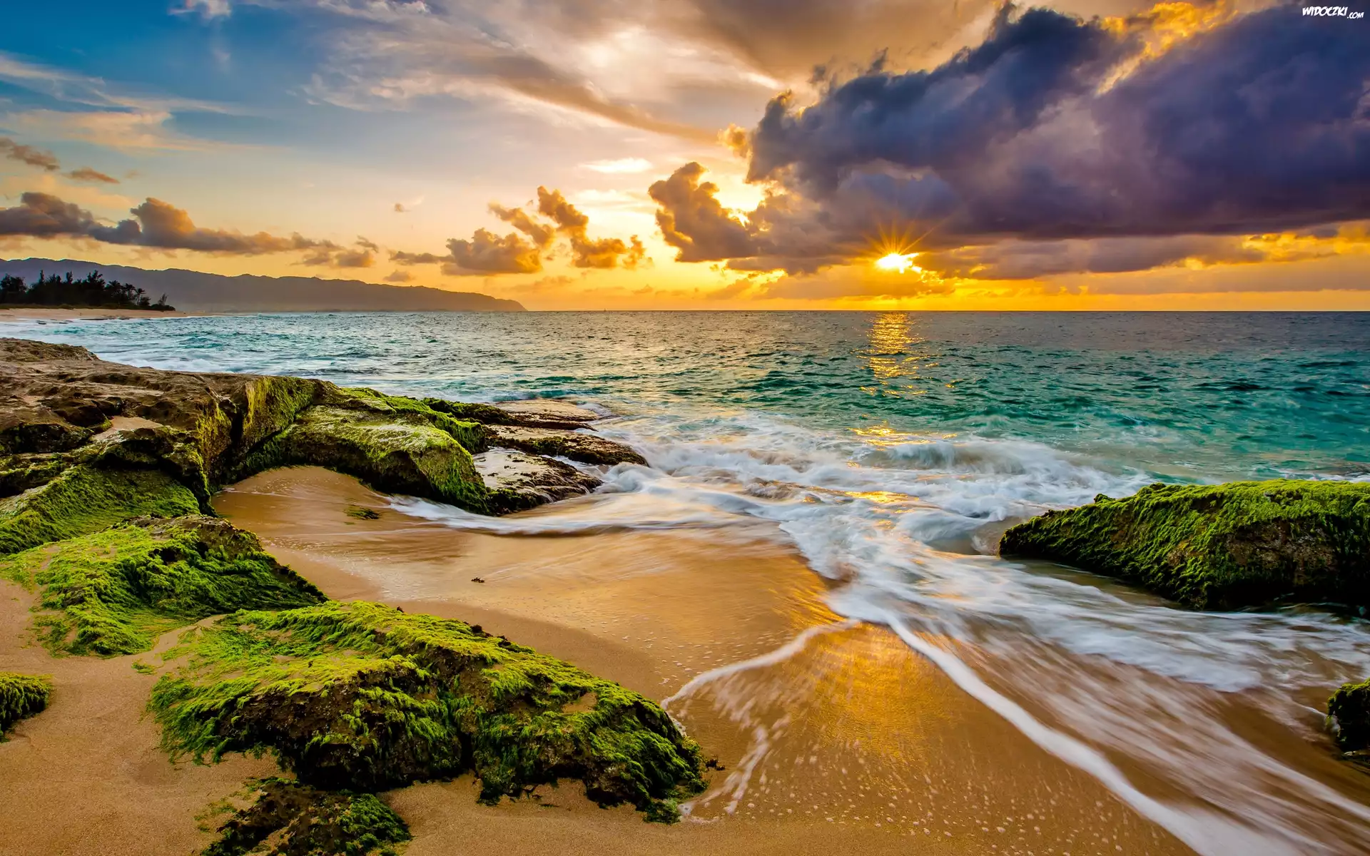 Morze, Ciemne, Chmury, Promienie słońca, Omszałe, Kamienie