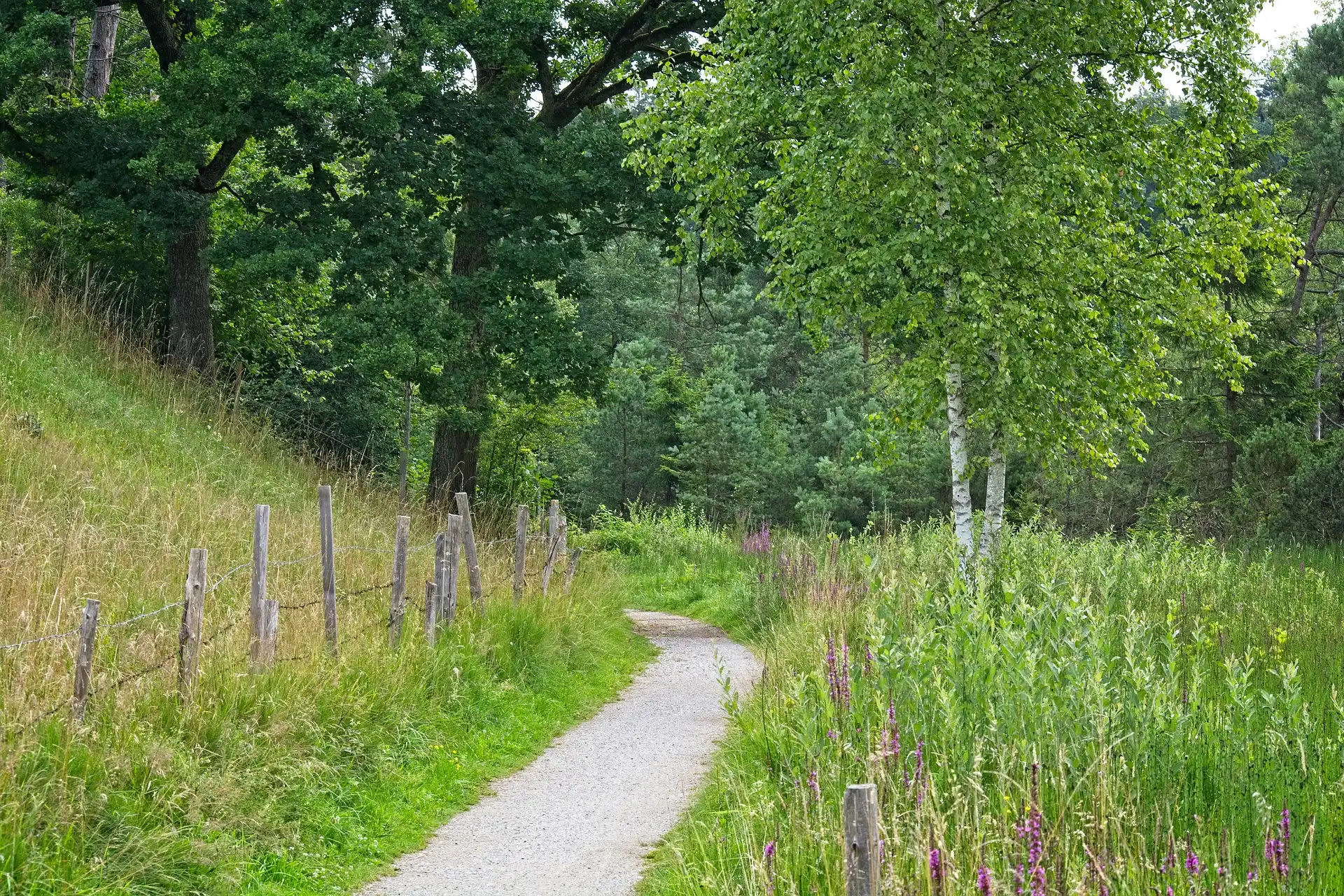 Zdjęcia, Ścieżka, Ogrodzenie, Drzewa, Brzozy, Łąka, Kwiaty