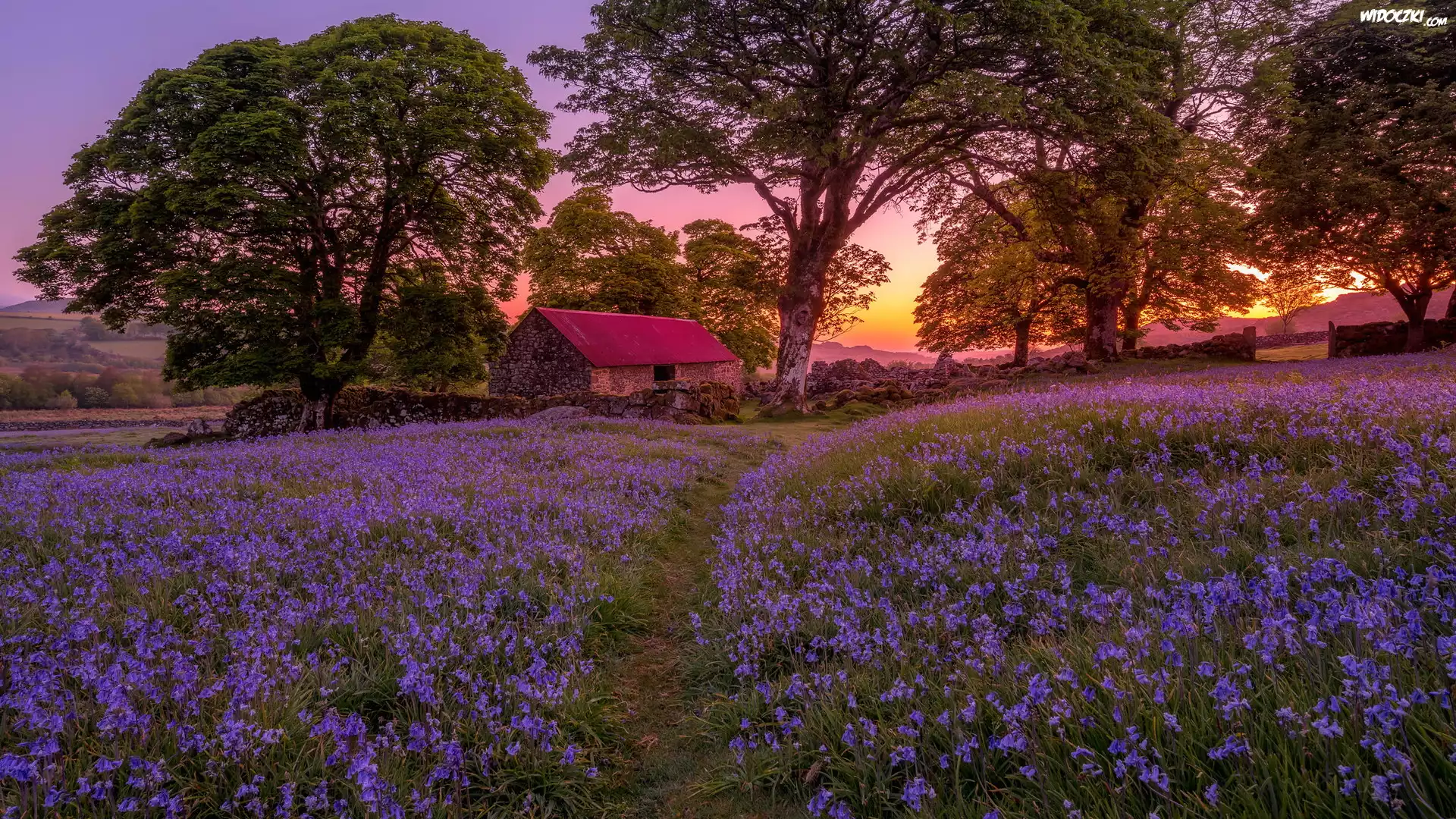 Zdjęcia, Łąka, Ścieżka, Kwiaty, Dzwonki, Drzewa, Dom, Murek, Zachód słońca, Wiosna