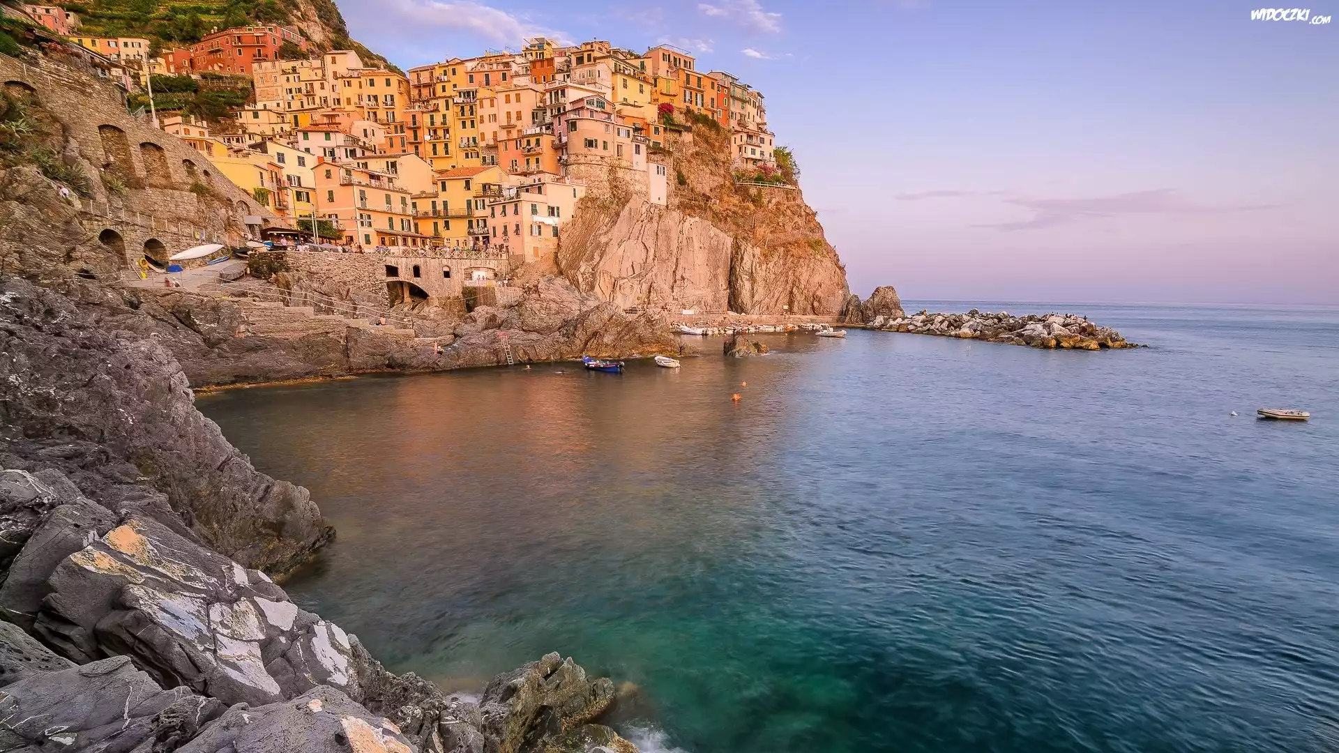 Zdjęcia, Włochy, Gmina Riomaggiore, Manarola, Morze Liguryjskie, Cinque Terre, Domy, Skały, Zatoka