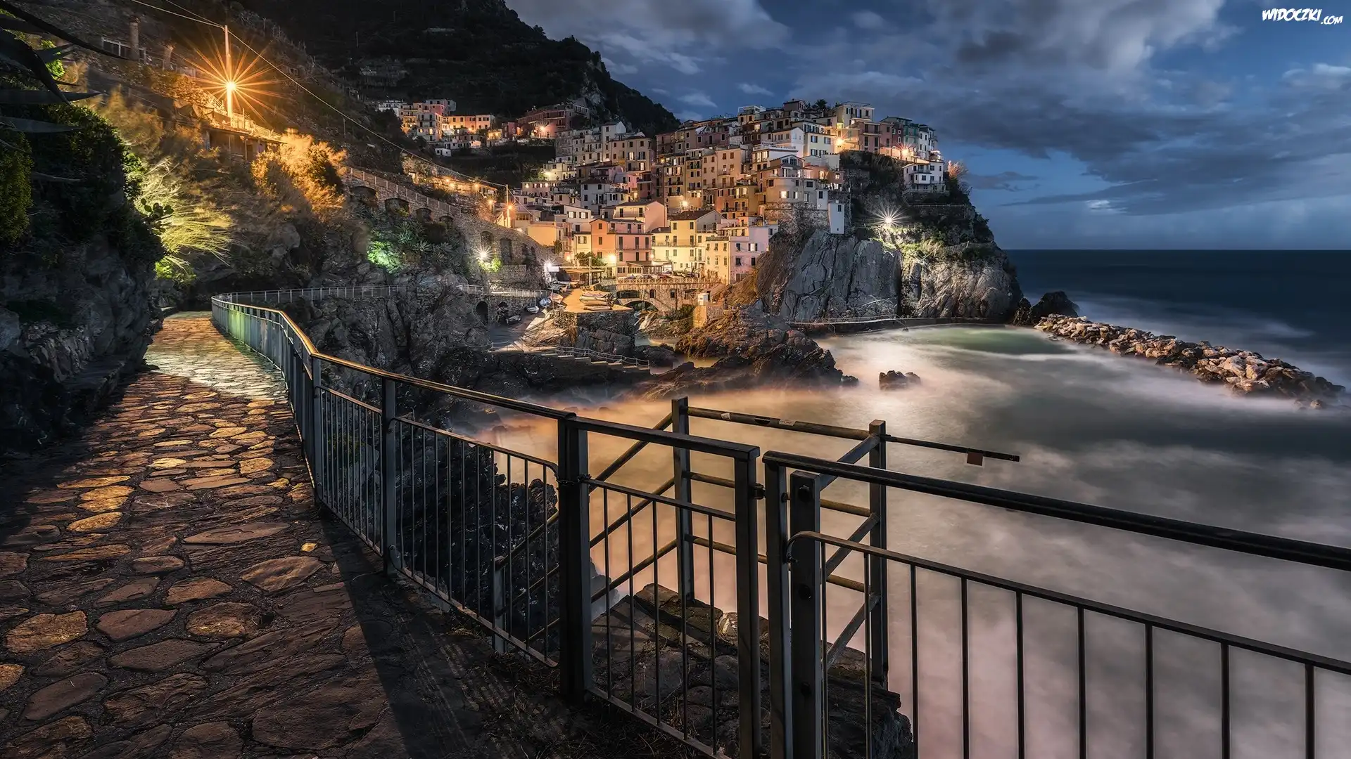 Włochy, Gmina Riomaggiore, Manarola, Cinque Terre, Morze Liguryjskie, Kolorowe, Domy, Światła, Noc, Chmury, Zatoka |