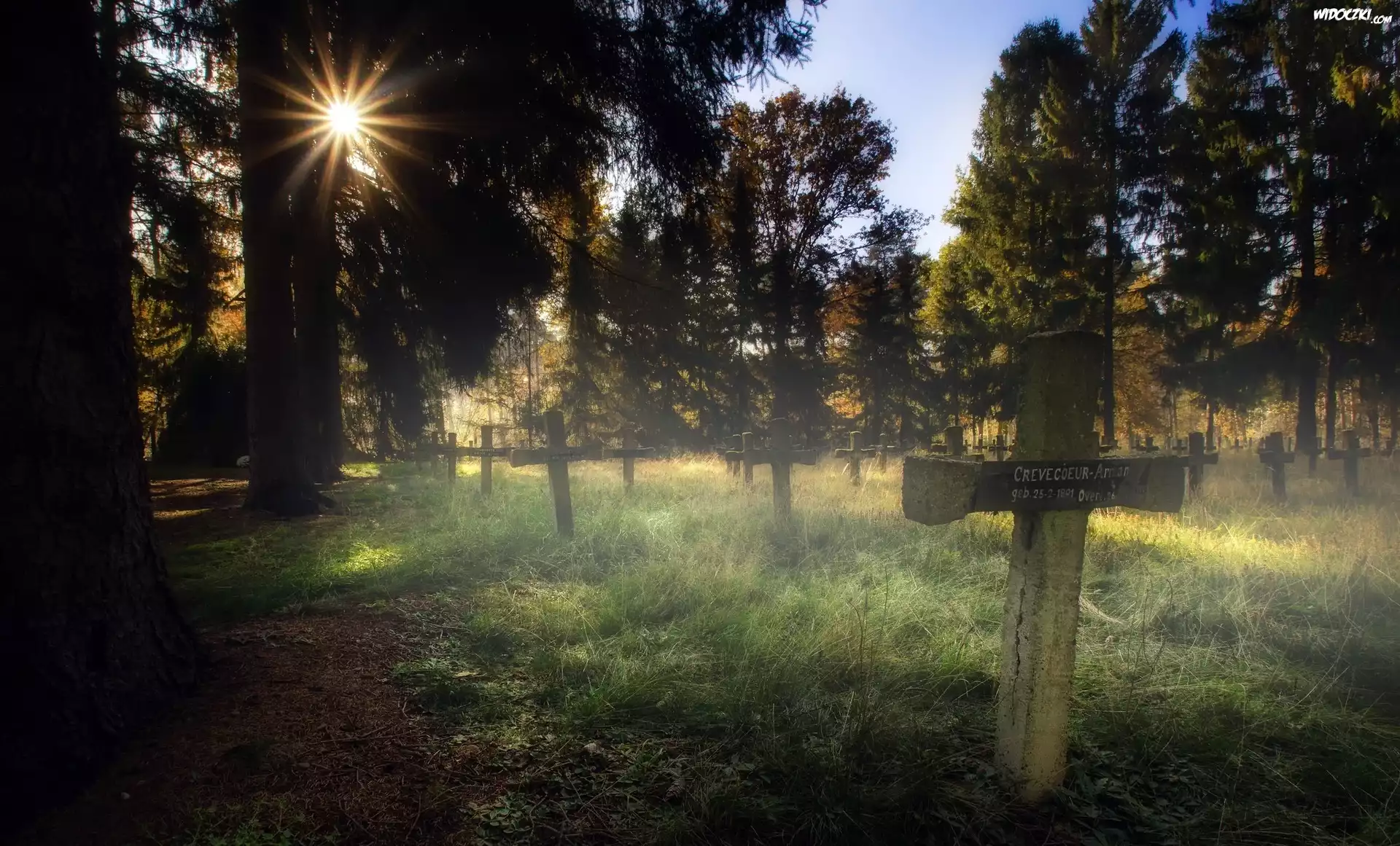 Zdjęcia, Cmentarz, Drzewa, Poranek, Mgła, Promienie słońca