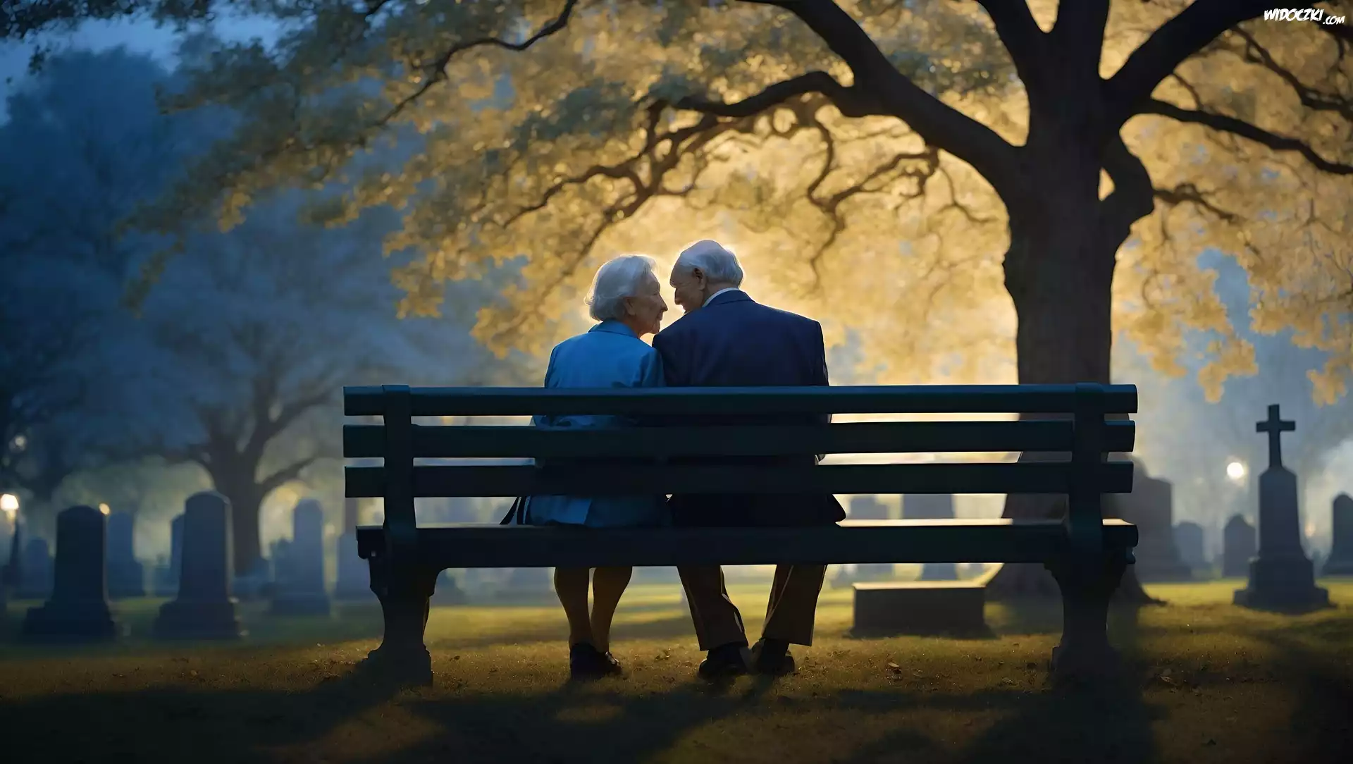 Zdjęcia, Kobieta, Mężczyzna, Starsi, Ludzie, Uczucie, Ławka, Drzewo, Cmentarz