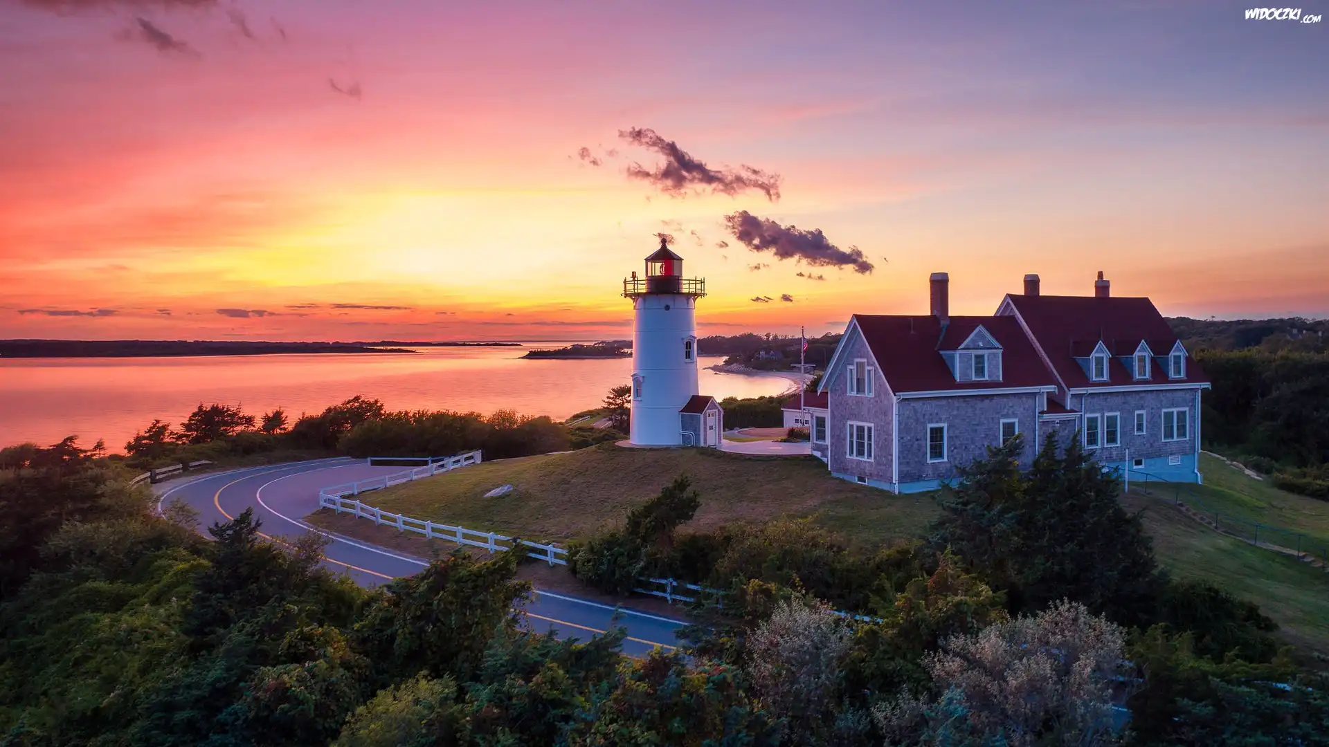 Stany Zjednoczone, Stan Massachusetts, Zatoka, Cape Cod Bay, Morze, Latarnia morska, Nobska Point Ligh, Zachód słońca |
