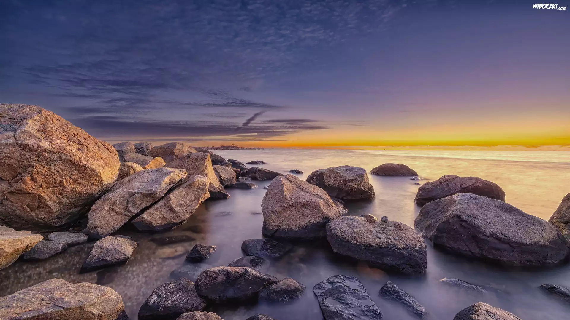 Wschód słońca, Park Stanowy, Hammonasset Beach, Plaża, Kamienie, Madison, Connecticut, Stany Zjednoczone |