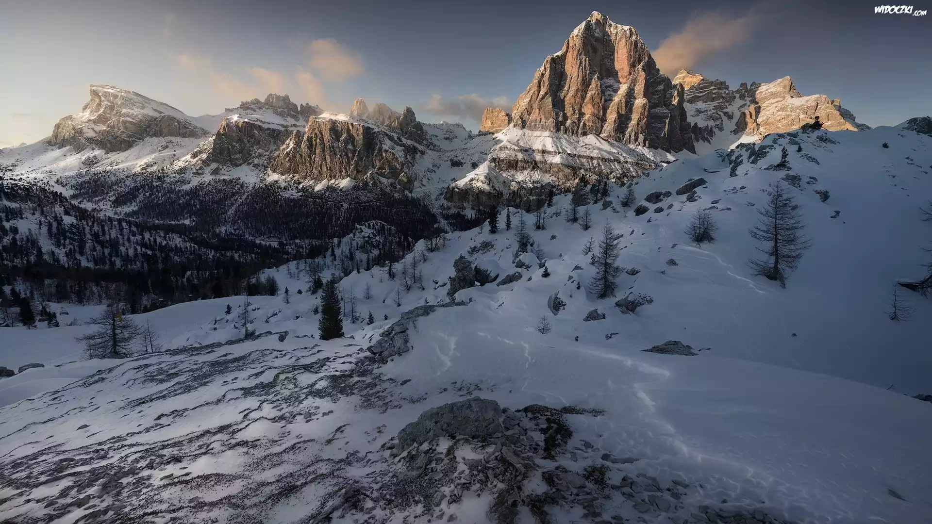 ZdjÄ™cia, Przełęcz Falzarego Pass, Gmina Cortina d’Ampezzo, WÅ‚ochy, Góry Dolomity, Zima, Góry, Drzewa