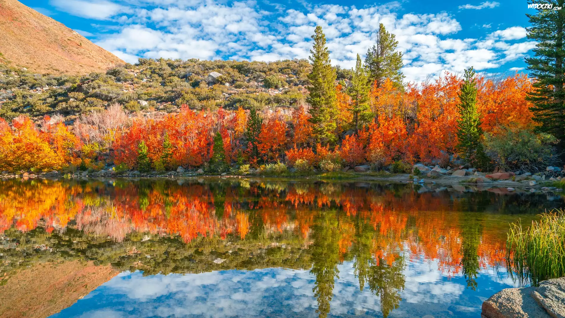 Zdjęcia, Rzeka, Bishop Creek, Jesień, Krzewy, Drzewa, Góry, Chmury, Kalifornia, Stany Zjednoczone