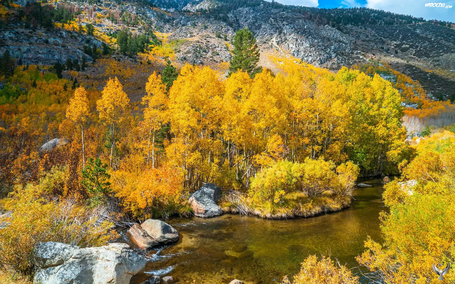Rzeka, Bishop Creek, Jesień, Krzewy, Pożółkłe, Drzewa, Góry, Kalifornia, Stany Zjednoczone