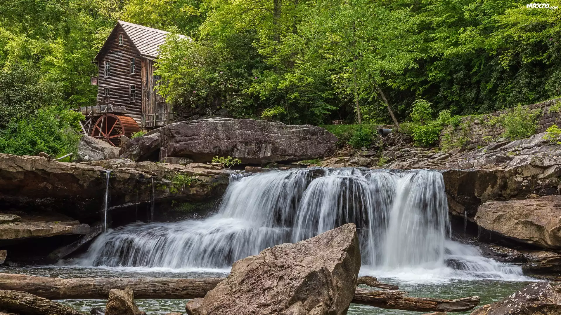 Las, Rzeka, Skały, Młyn wodny, Glade Creek Grist Mill, Park Babcock State, Wirginia Zachodnia, Stany Zjednoczone |