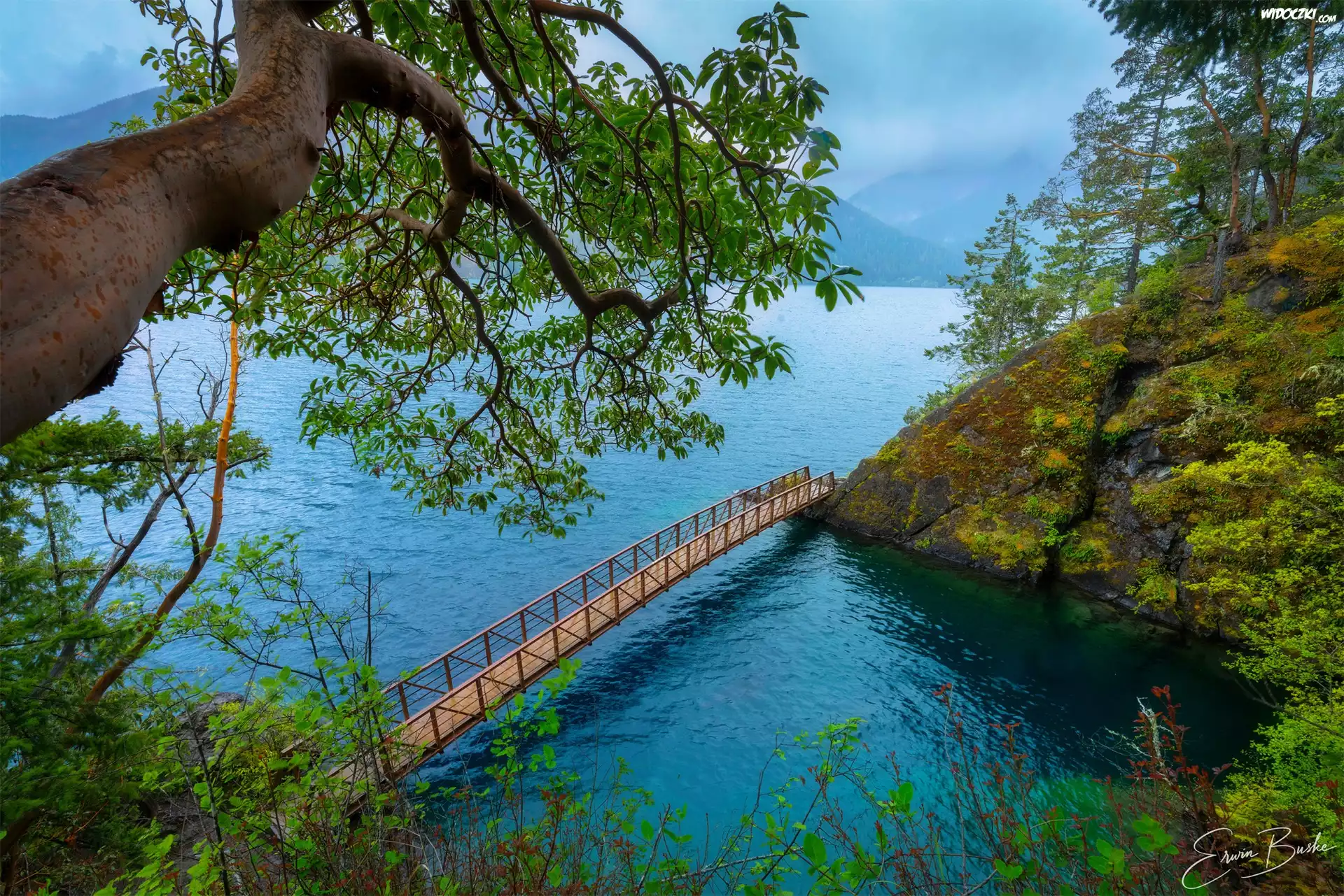 Stany Zjednoczone, Waszyngton, Park Narodowy Olympic, Jezioro, Crescent Lake, Most, Pochylone, Drzewo, Omszałe, Skały, Las |