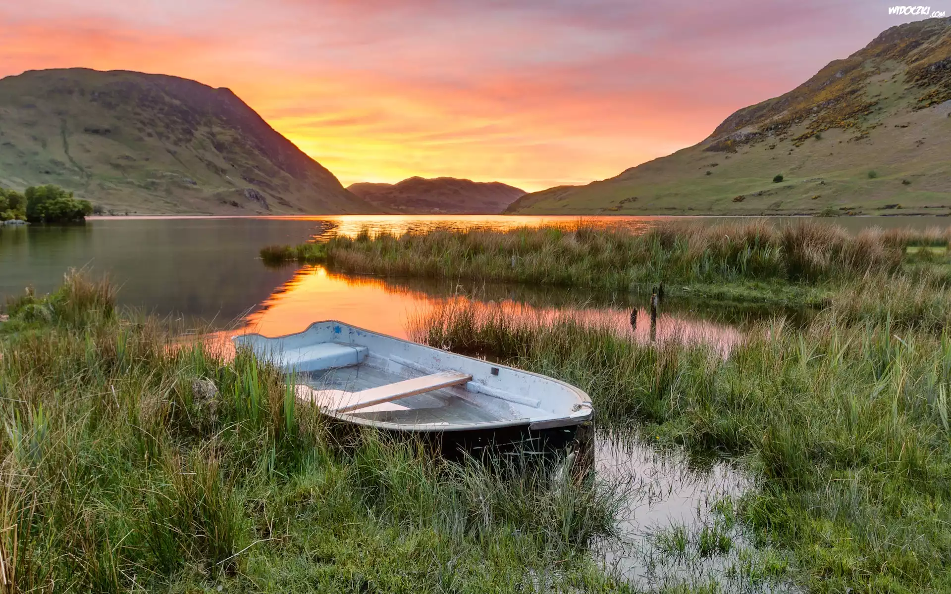Zdjęcia, Park Narodowy Lake District, Góry, Jezioro, Crummock Water, Łódka, Szuwary, Anglia
