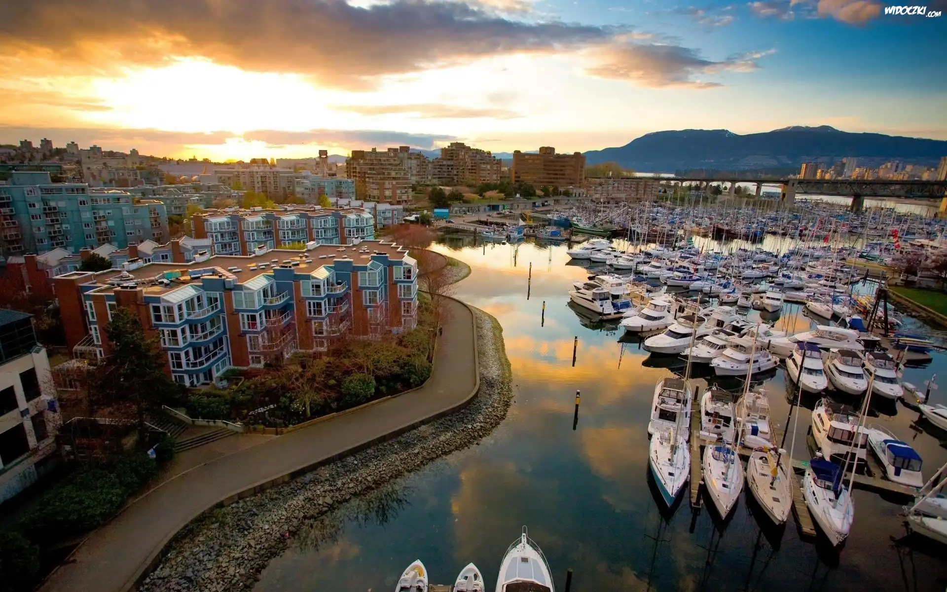 Zdjęcia, Rzeka, Cumowanie, Jachtów, Domy, Góry, Zachód, Słońca, Odbicie