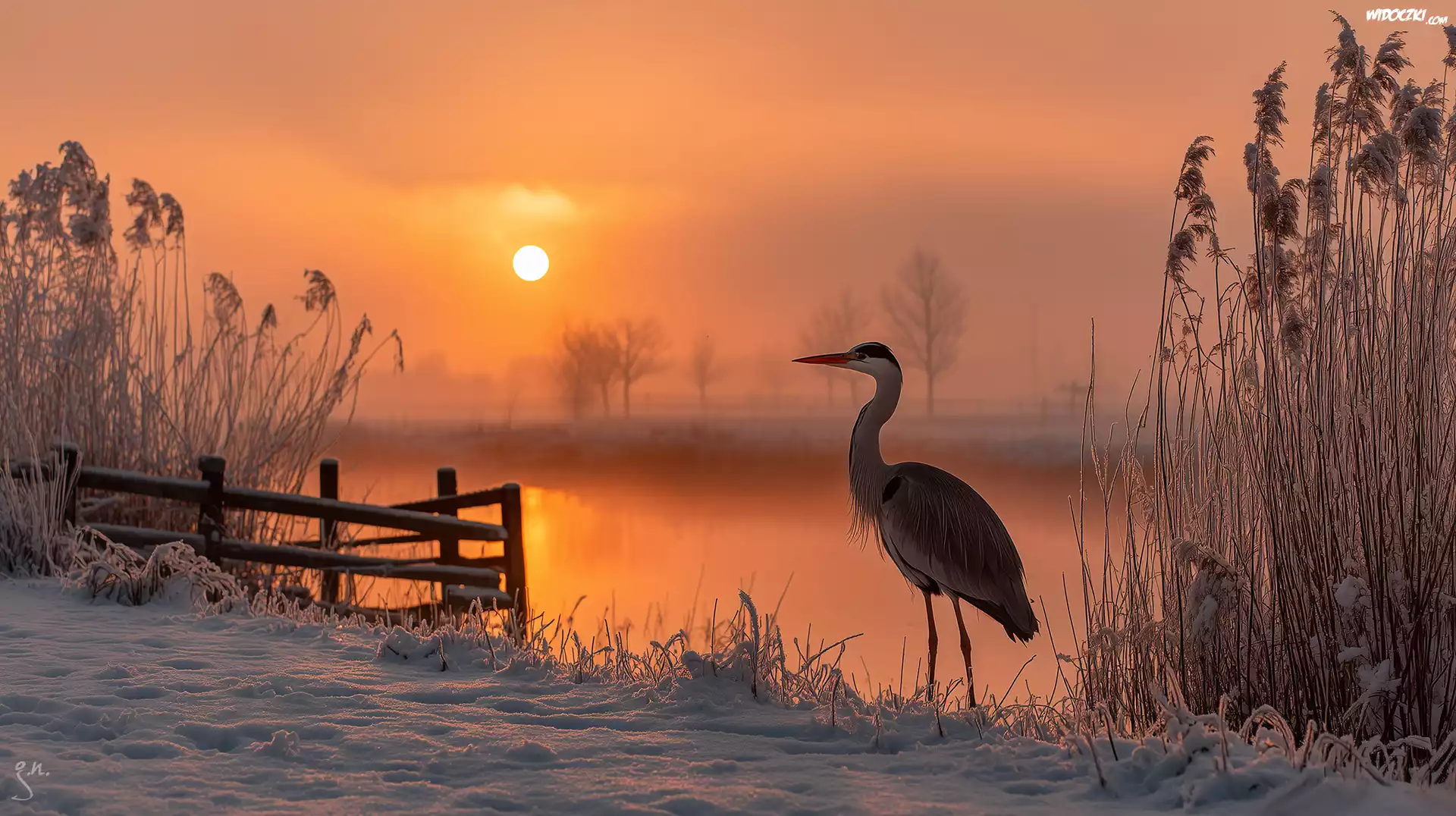 Zdjęcia, Czapla, Jezioro, Szuwary, Trzciny, Zima, Zachód słońca, Grafika AI