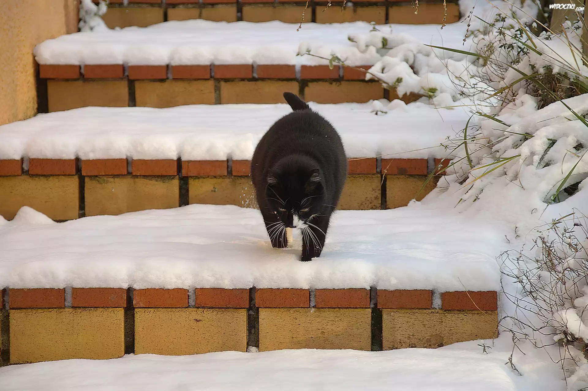 Zdjęcia, Czarny, Kotek, Schody, Zima