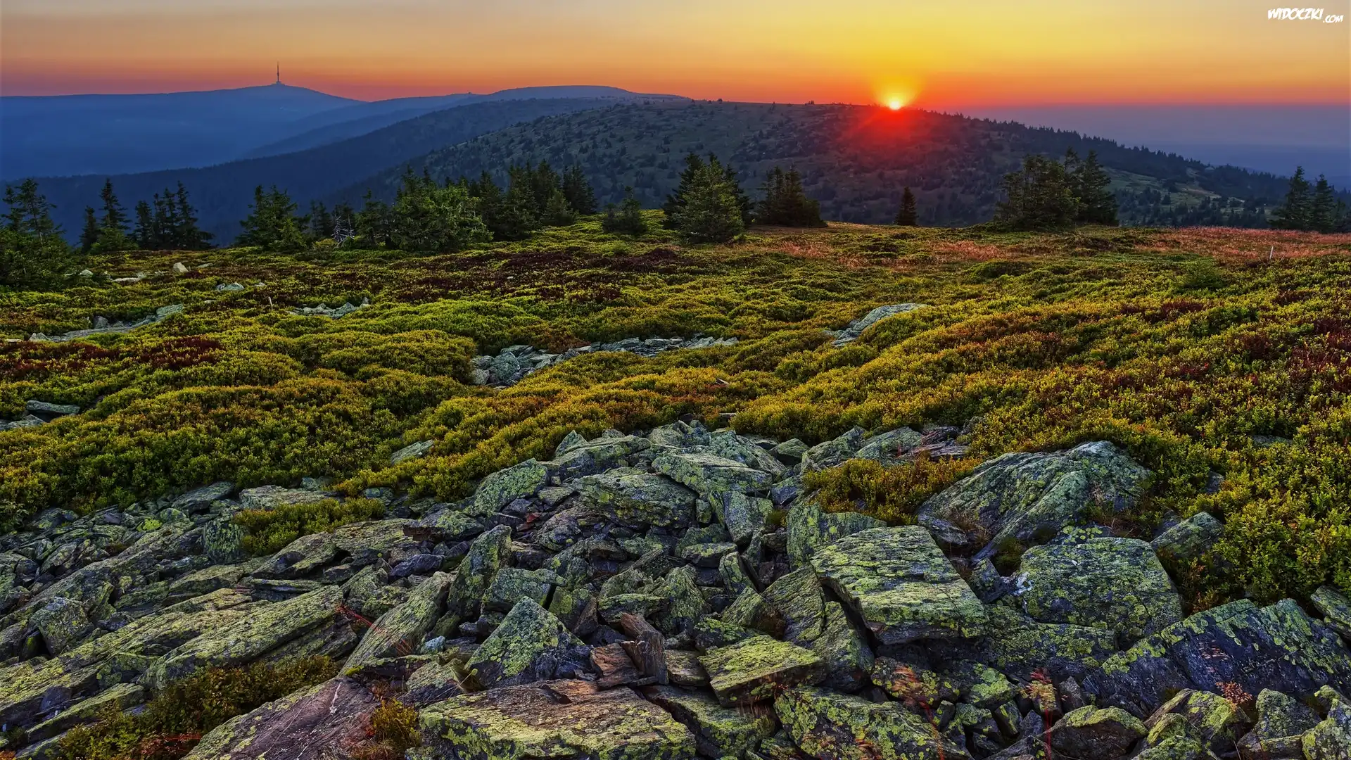 Zdjęcia, Wschód słońca, Góry Jesioniki, Sudety Wschodnie, Skały, Roślinność, Czechy