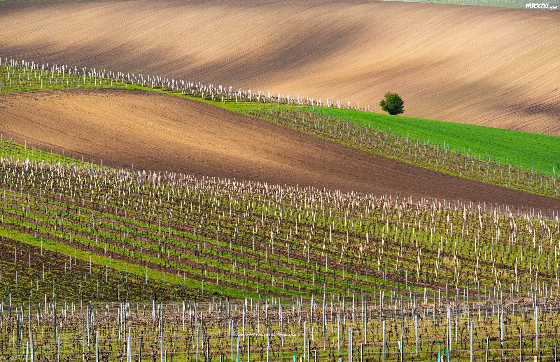 Czechy, Południowe Morawy, Pola, Pagórki, Plantacja, Uprawa winorośli, Drzewo