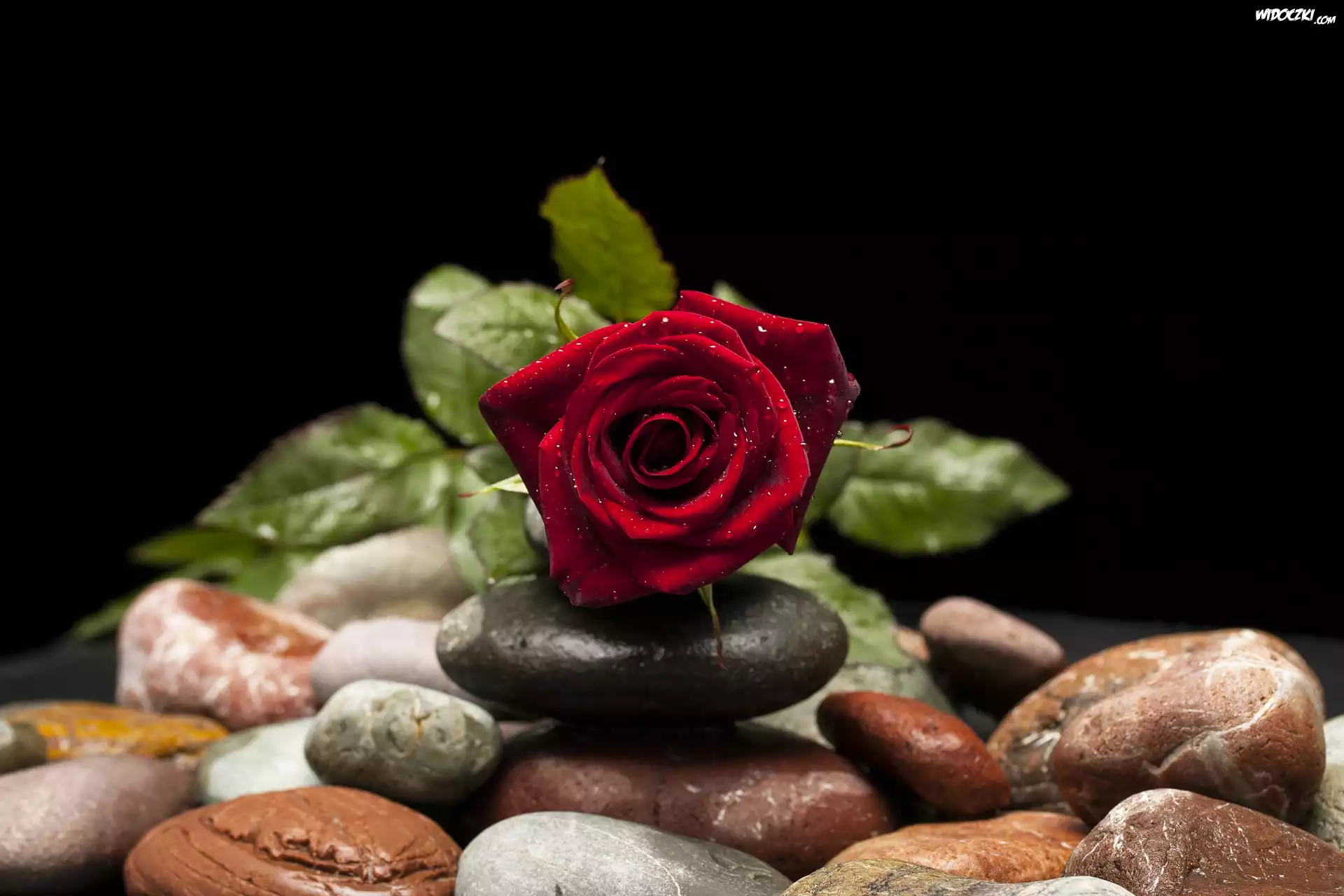 Czerwona, Róża, Kamienie, Czarne Tło
