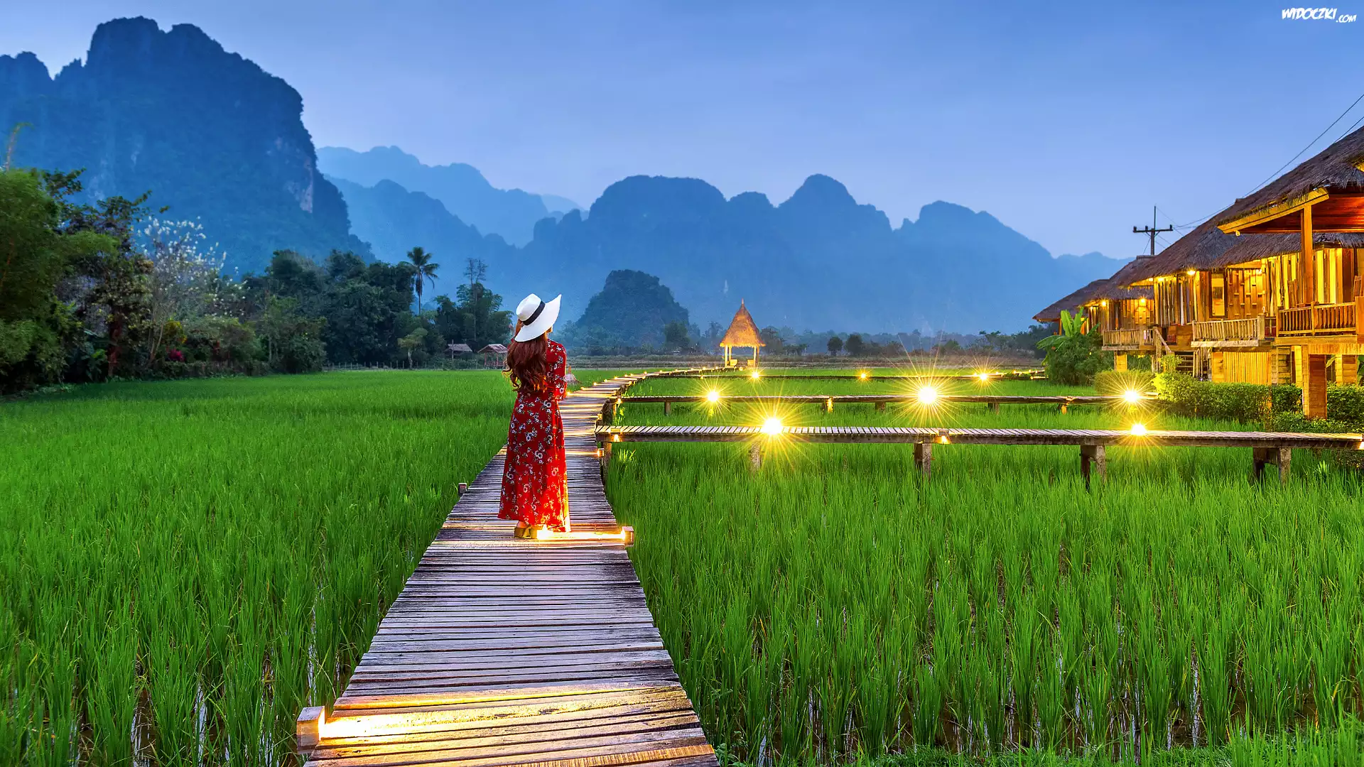Pola, Ryżowe, Dziewczyna, Kapelusz, Czerwona, Sukienka, Pomost, Domy, Oświetlenie, Góry, Drzewa, Vang Vieng, Laos |