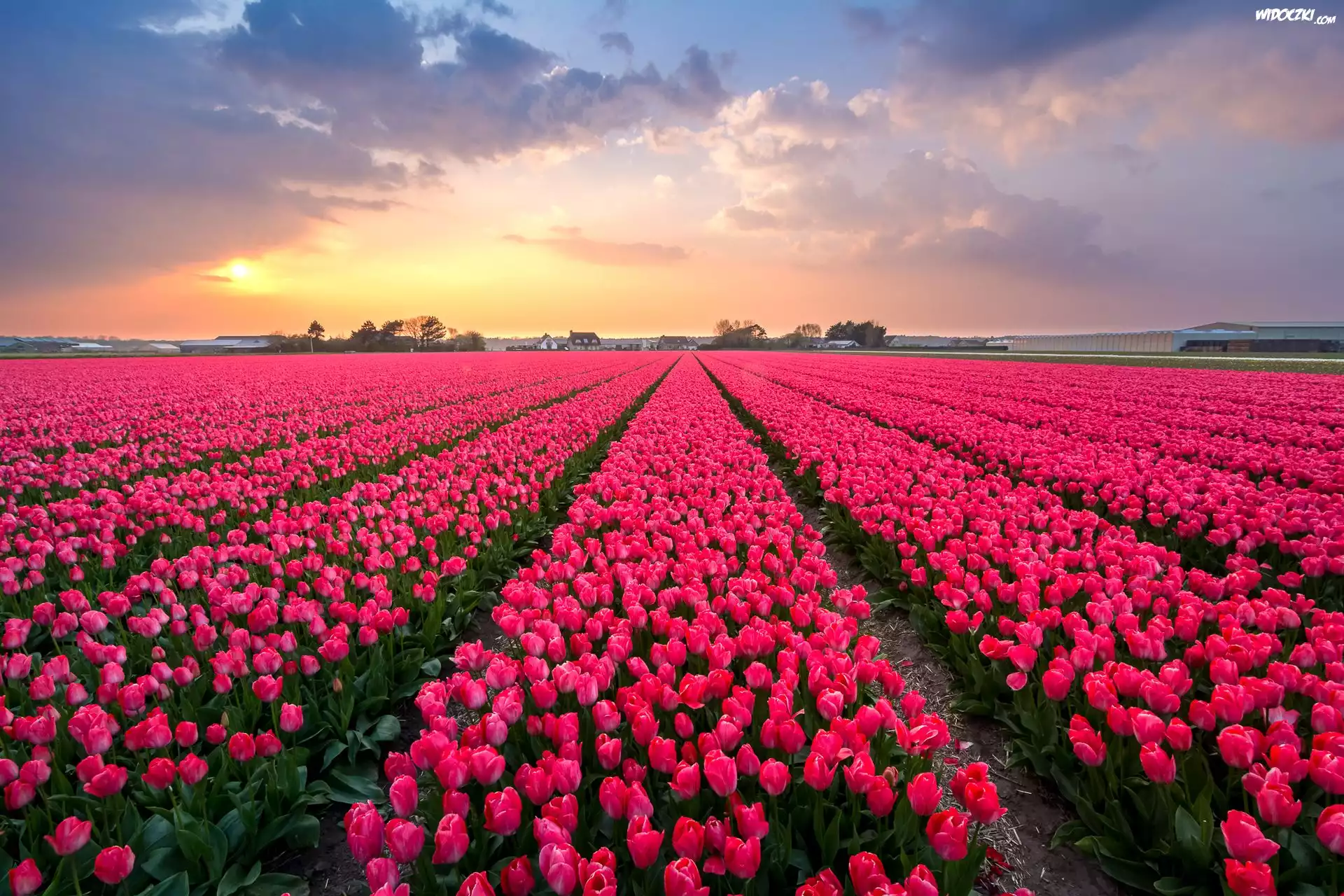 Zdjęcia, Pole, Plantacja, Kwiaty, Czerwone, Tulipany, Chmury