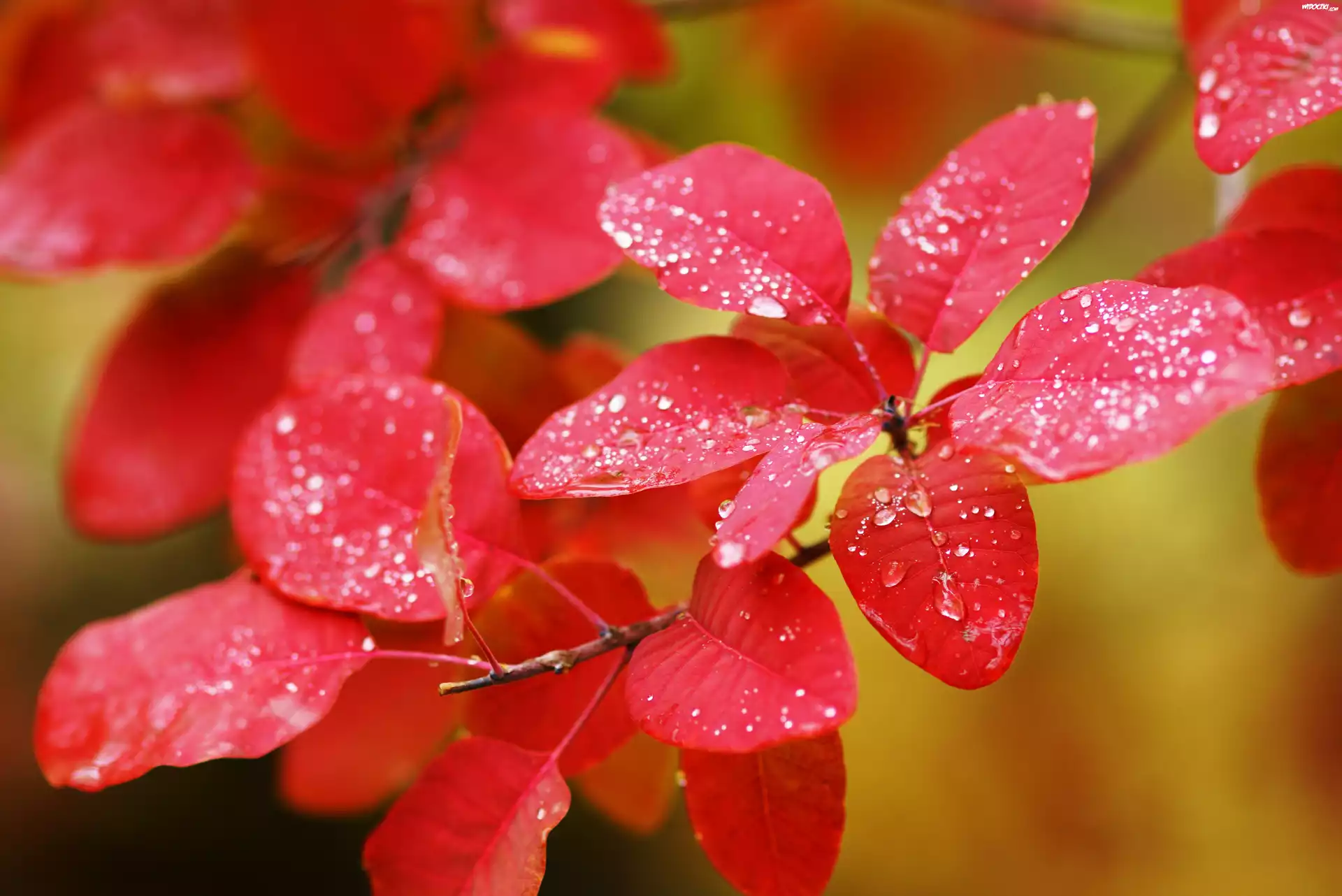 Czerwone, Liście, Berberysu, Krople, Jesień