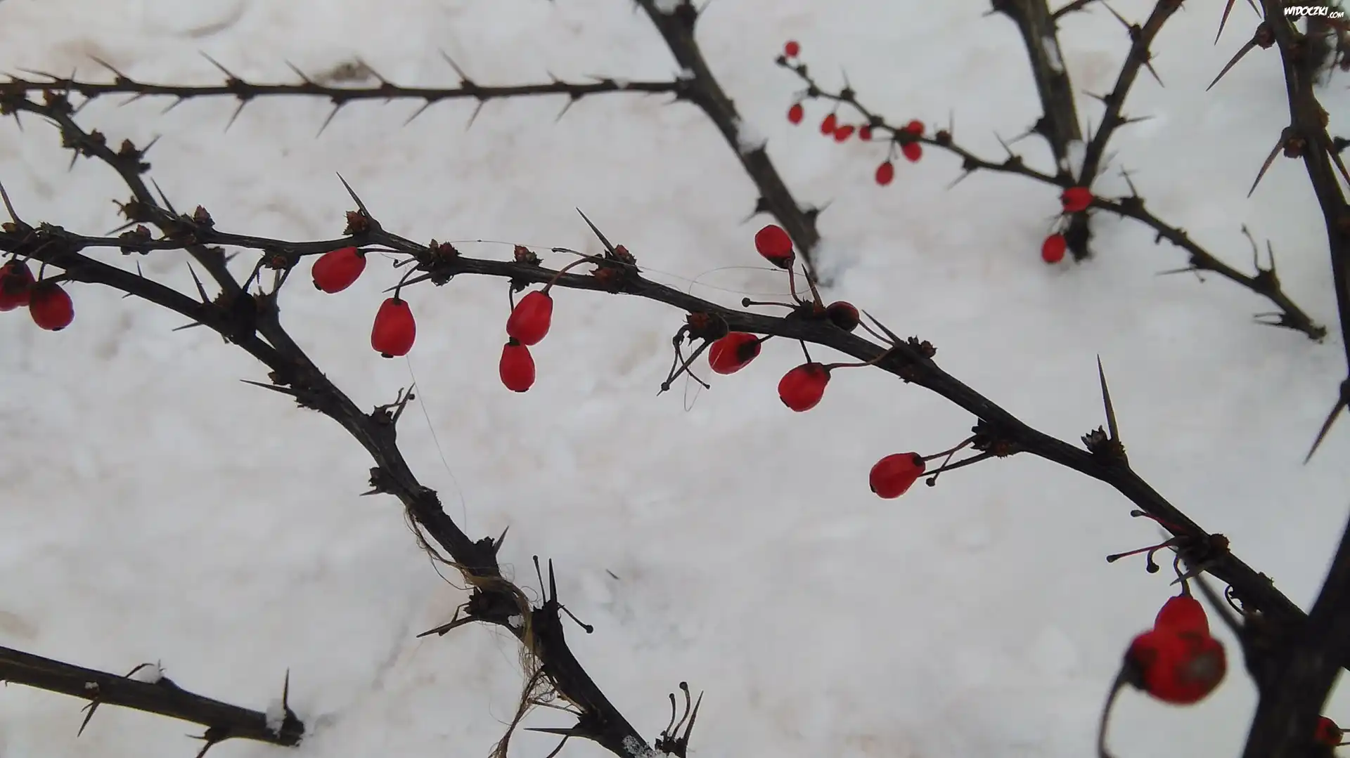 Zdjęcia, Śnieg, Krzew, Kolce, Czerwone, Owoce