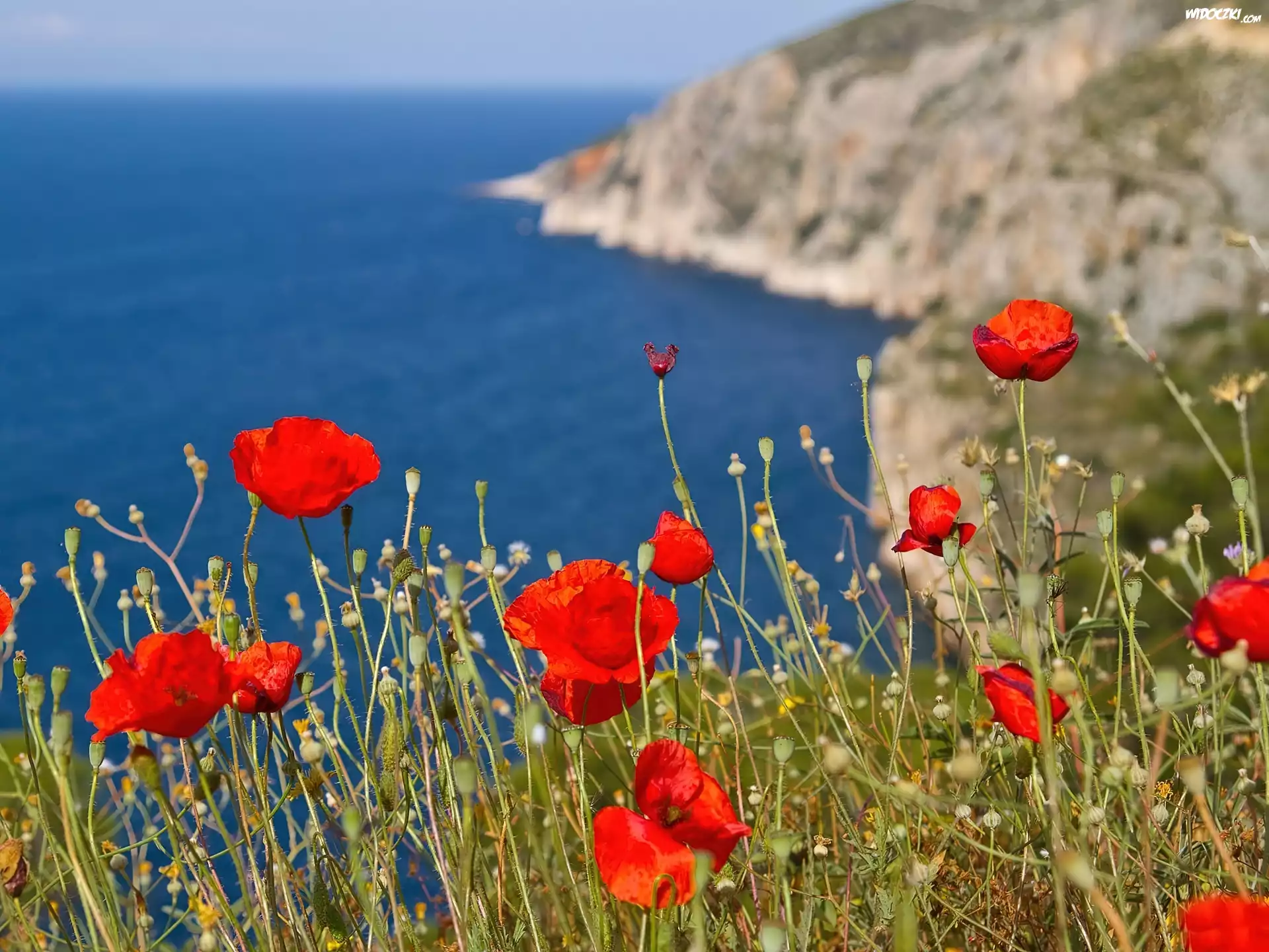 Zdjęcia, Czerwone, Maki, Morze, Skały